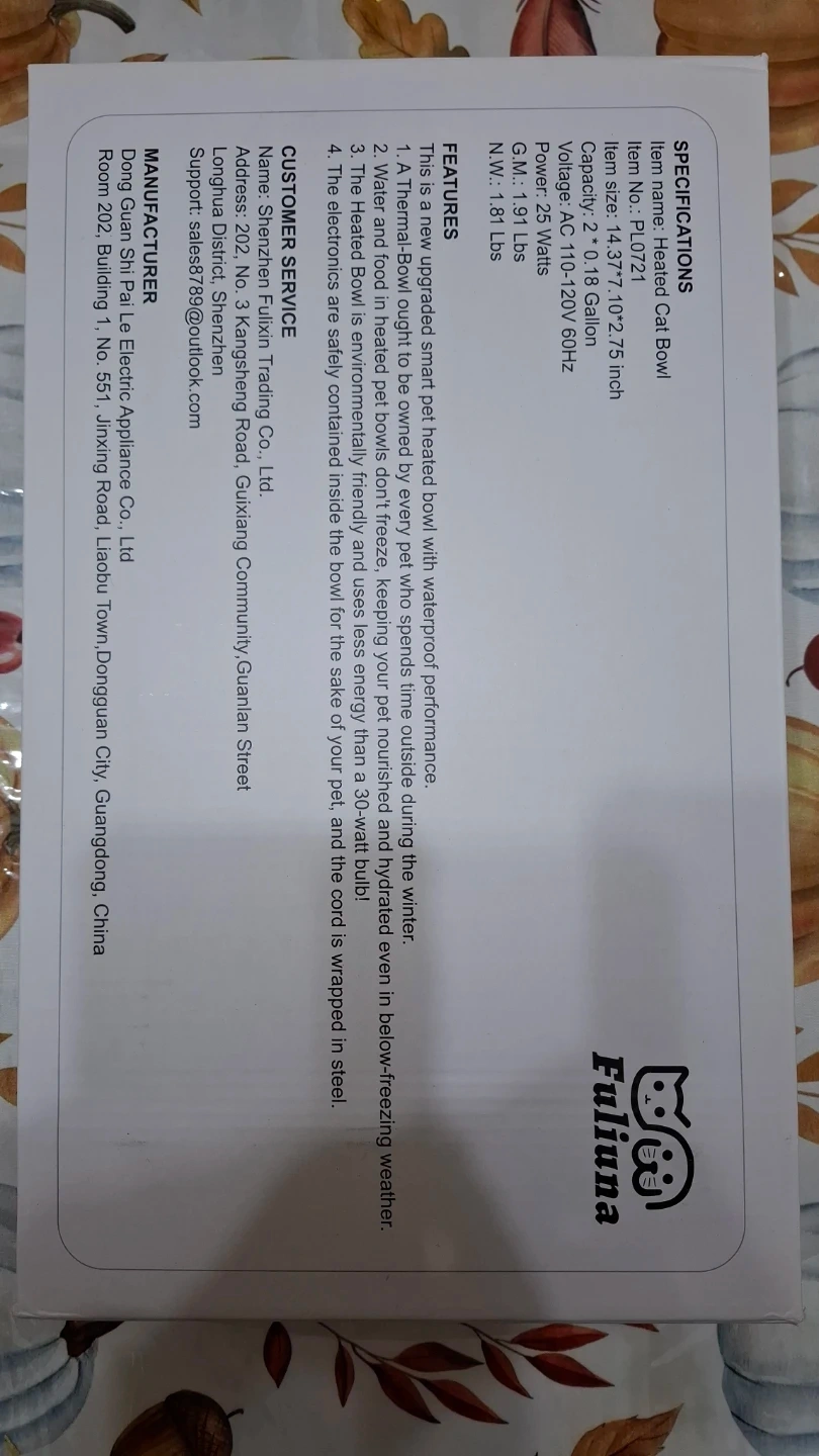 Selling a Fuliuna heated pet bowl for both food and water. It's in great condition and ready to keep your kitty's food and water at the perfect temperature. In perfect working order. Comes with the original box. No longer needed as outdoor cat passed away.