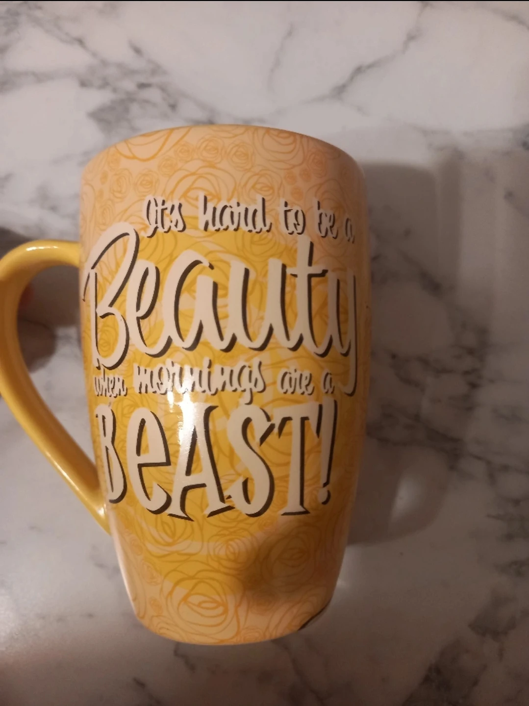 Official Disney merch with Belle from Beauty and the Beast. It says "It's hard to be a Beauty when mornings are a Beast". Holds more than a small 250mL, and IS microwaveable (compared to most merch mugs that are not.