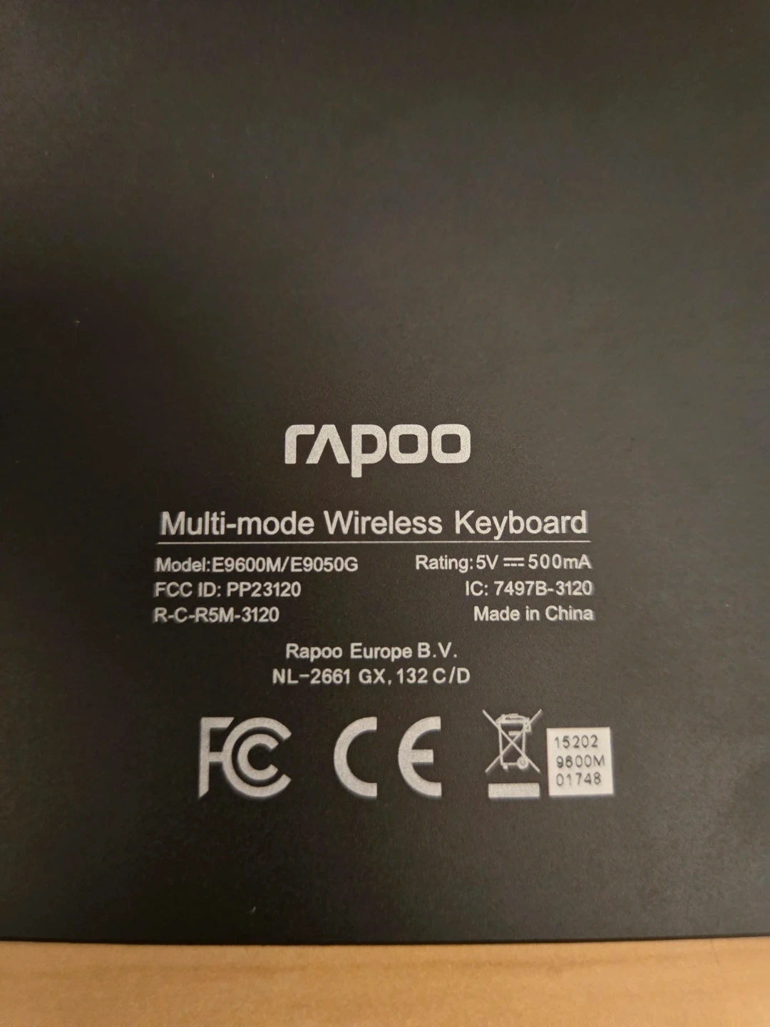 42Selling a Rapoo multi-mode wireless keyboard, model E9600M/E9050G. It comes with the wireless receiver in a plastic bag. Barely used, great condition. No batteries required, charges with USB-C