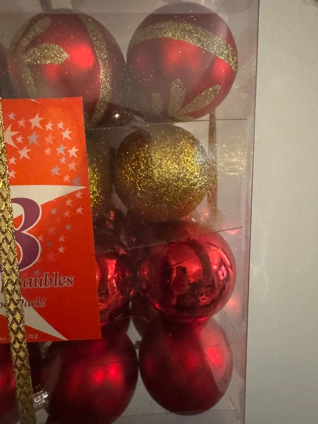 These Christmas ornaments come in a mix of red and gold, perfect for adding a festive touch to your tree. They're shatterproof, so you don't have to worry about them breaking if they fall. Comes in the original packaging