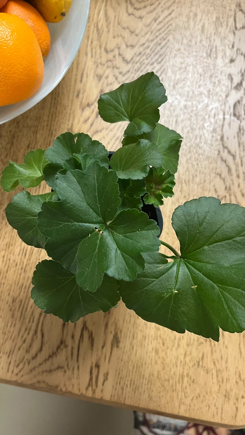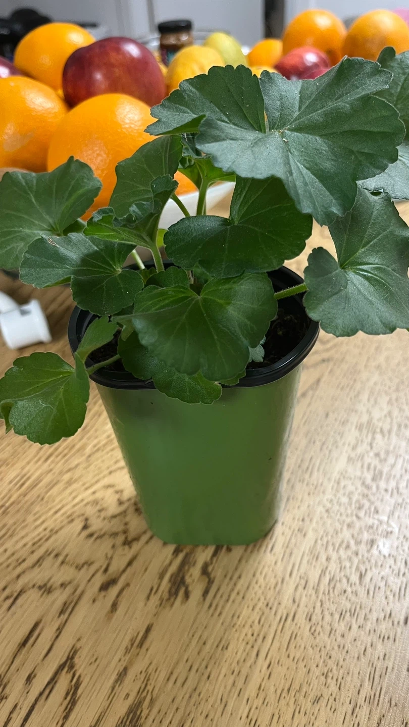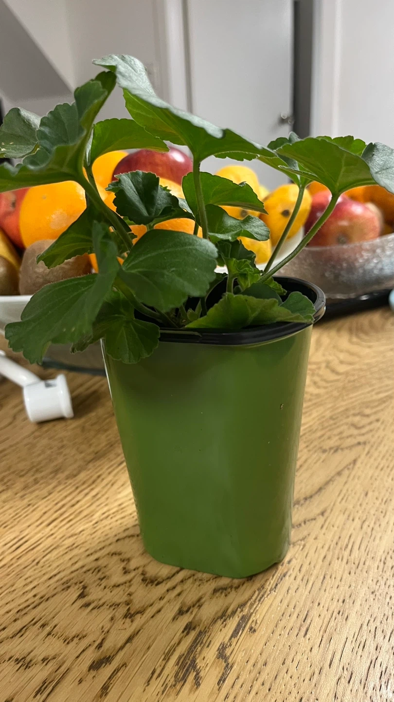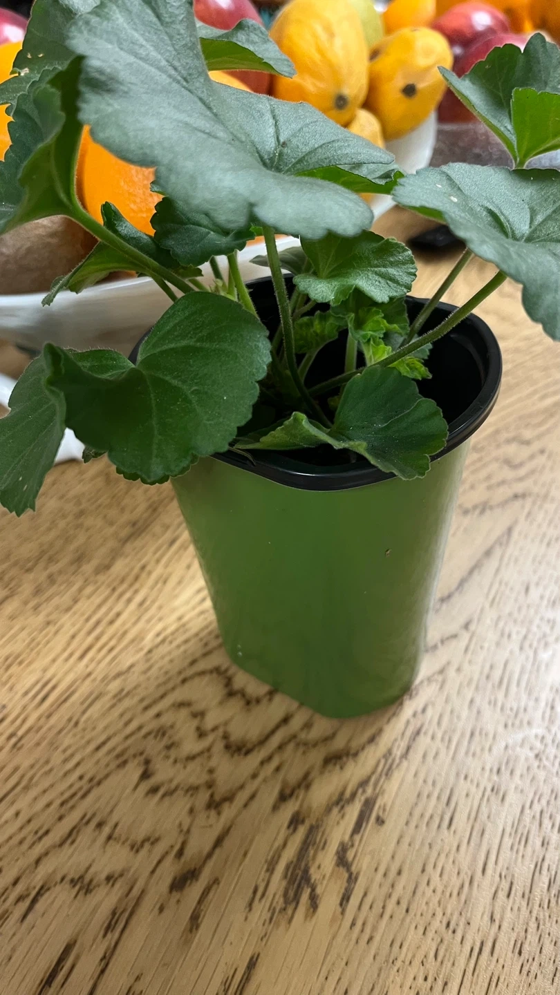 A healthy geranium plant in a green pot, ready to brighten up your space! It's currently thriving and looking for a new home to flourish in. I have two plants.