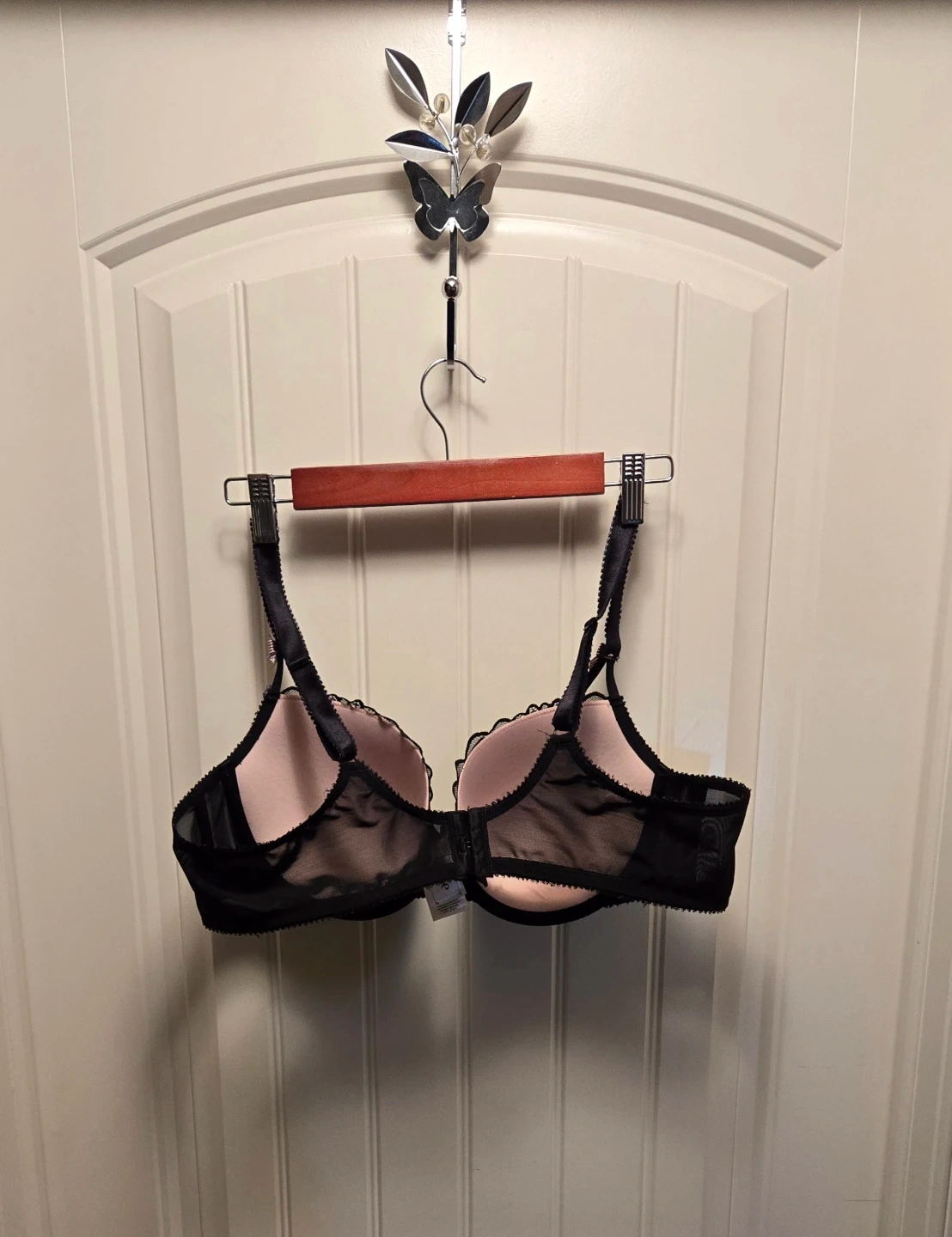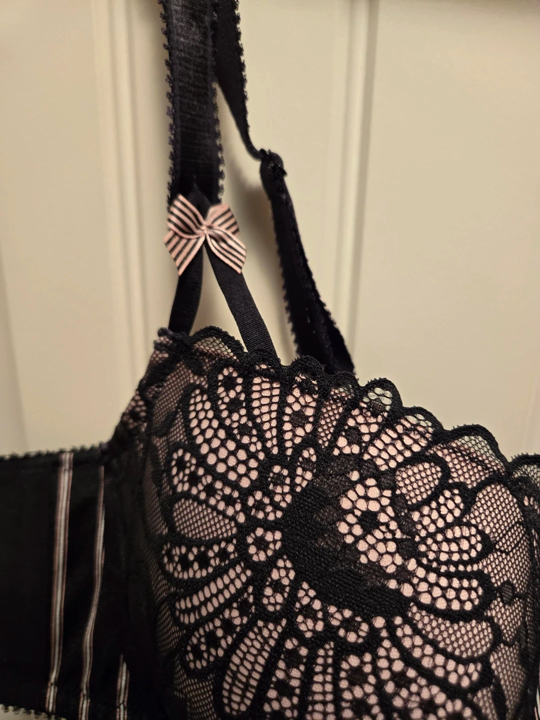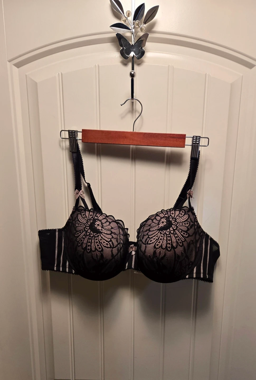 Great condition. Size 44B. Delicate lace detailing adds a touch of elegance. Black and pink. No try ons or returns. Dog friendly smoke free home. Cross-posted.