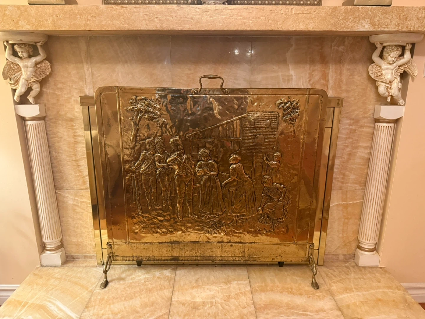 66Selling a vintage brass fireplace screen with a detailed embossed design. It's a beautiful piece that adds a touch of elegance to any living room. The screen is in good condition and ready to use!