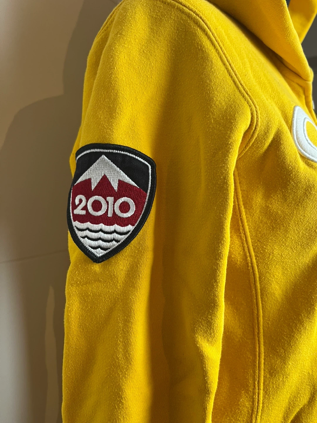 Selling a bright yellow Hudson's Bay Canada Olympic hoodie! It's a size 14 (Girls/Fille). The hoodie is made of 80% cotton and 20% polyester. It features the Canada logo on the front and Olympic patches on the sleeves, commemorating the 2010 Olympics.