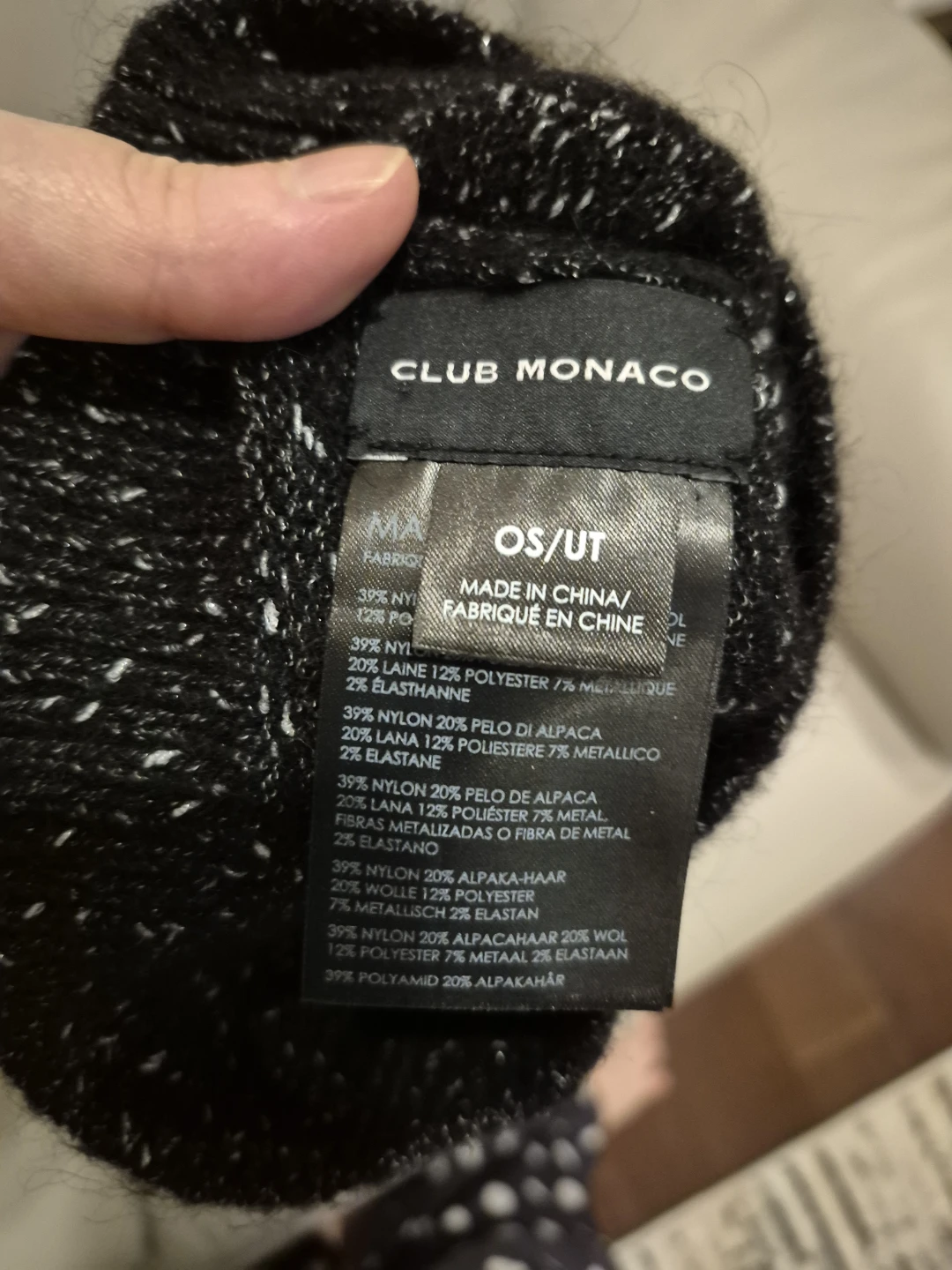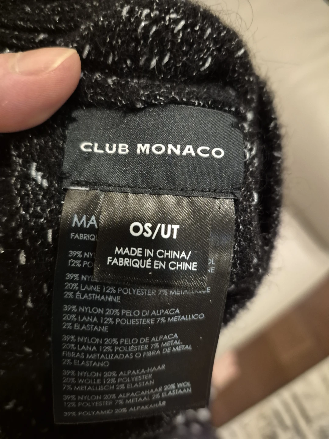 Selling a Club Monaco beanie in black. It's a OS/UT size and made in China. The fabric is 39% nylon, 20% alpaca hair, 12% polyester, and 7% metallic with 2% elastane