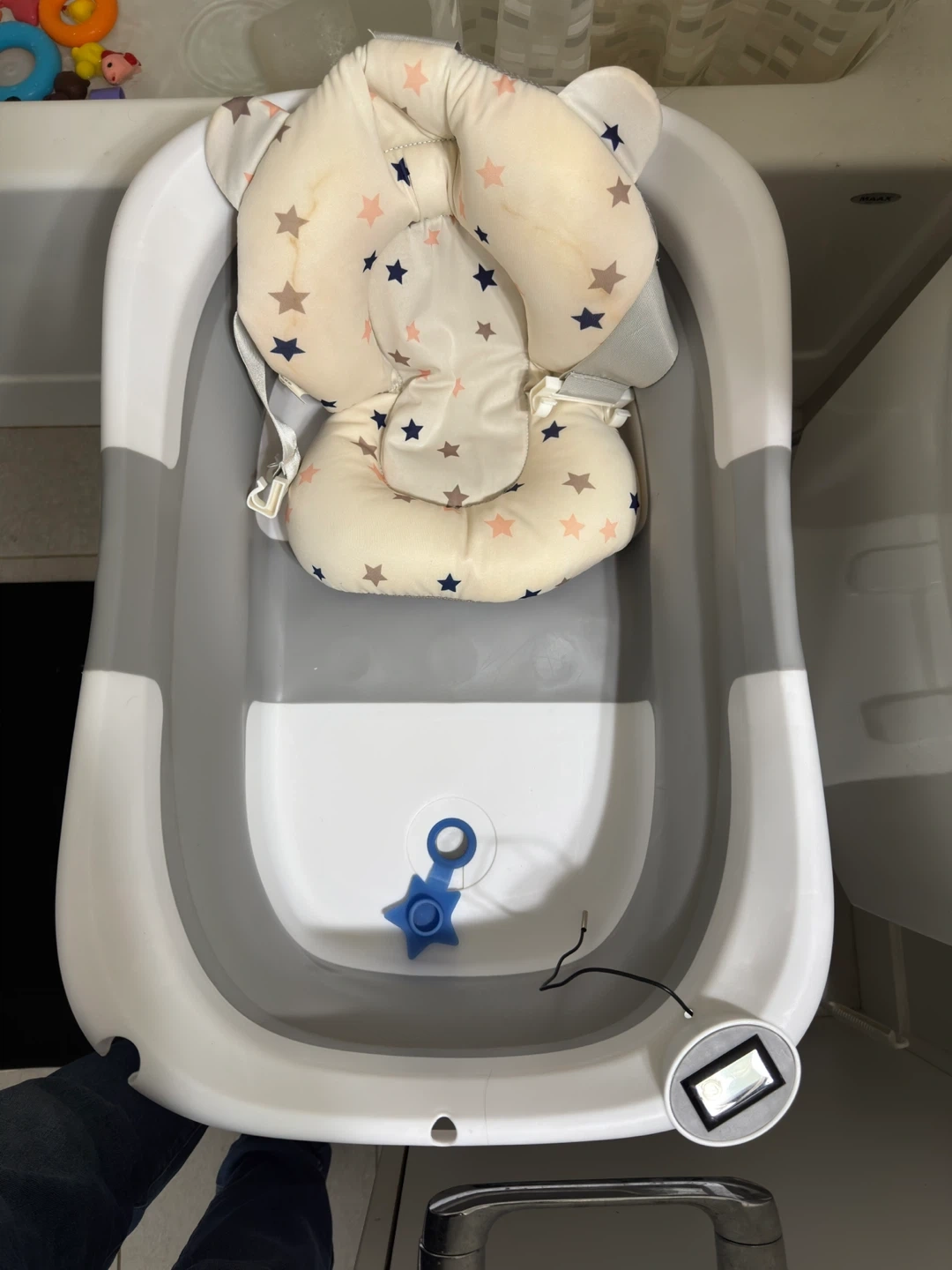 Selling a baby bathtub with a star-patterned pillow insert. The pillow and the tub itself is in good condition. Comes with a blue star-shaped drain plug and a thermometer. The thermometer battery required replacement.