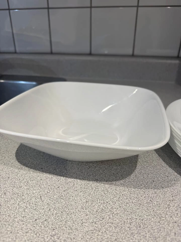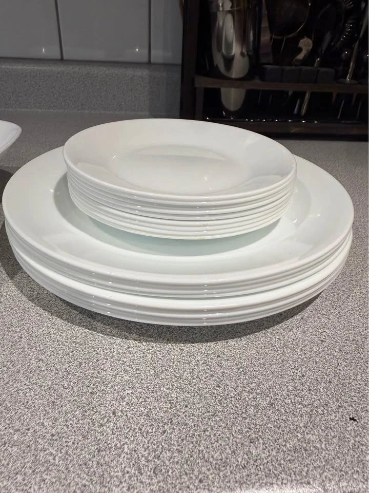 White plates and serving bowl