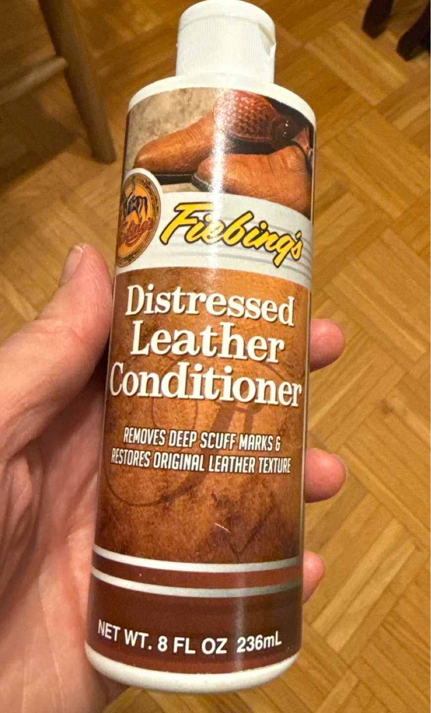 Selling a bottle of Fiebing's Distressed Leather Conditioner. It's an 8 fl oz bottle that's great for removing deep scuff marks and restoring the original leather texture of your items. Used twice only. Regularly sold for $10.