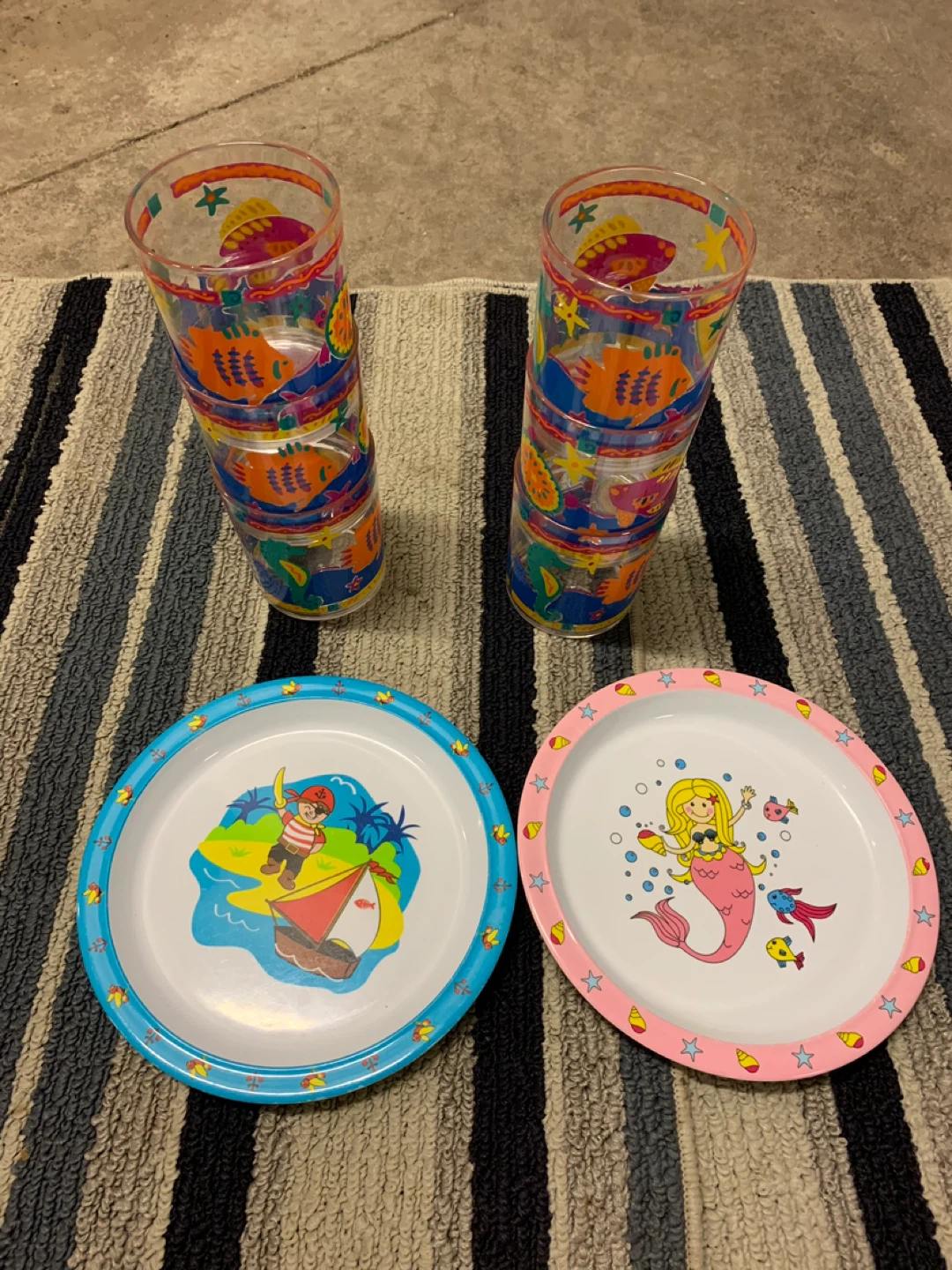 Selling a set of plastic cups and plates for kids! The cups have fun sea creature designs, and the plates feature a pirate and a mermaid. Great for picnics or everyday use