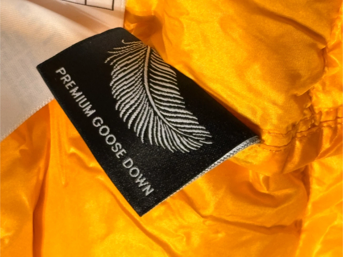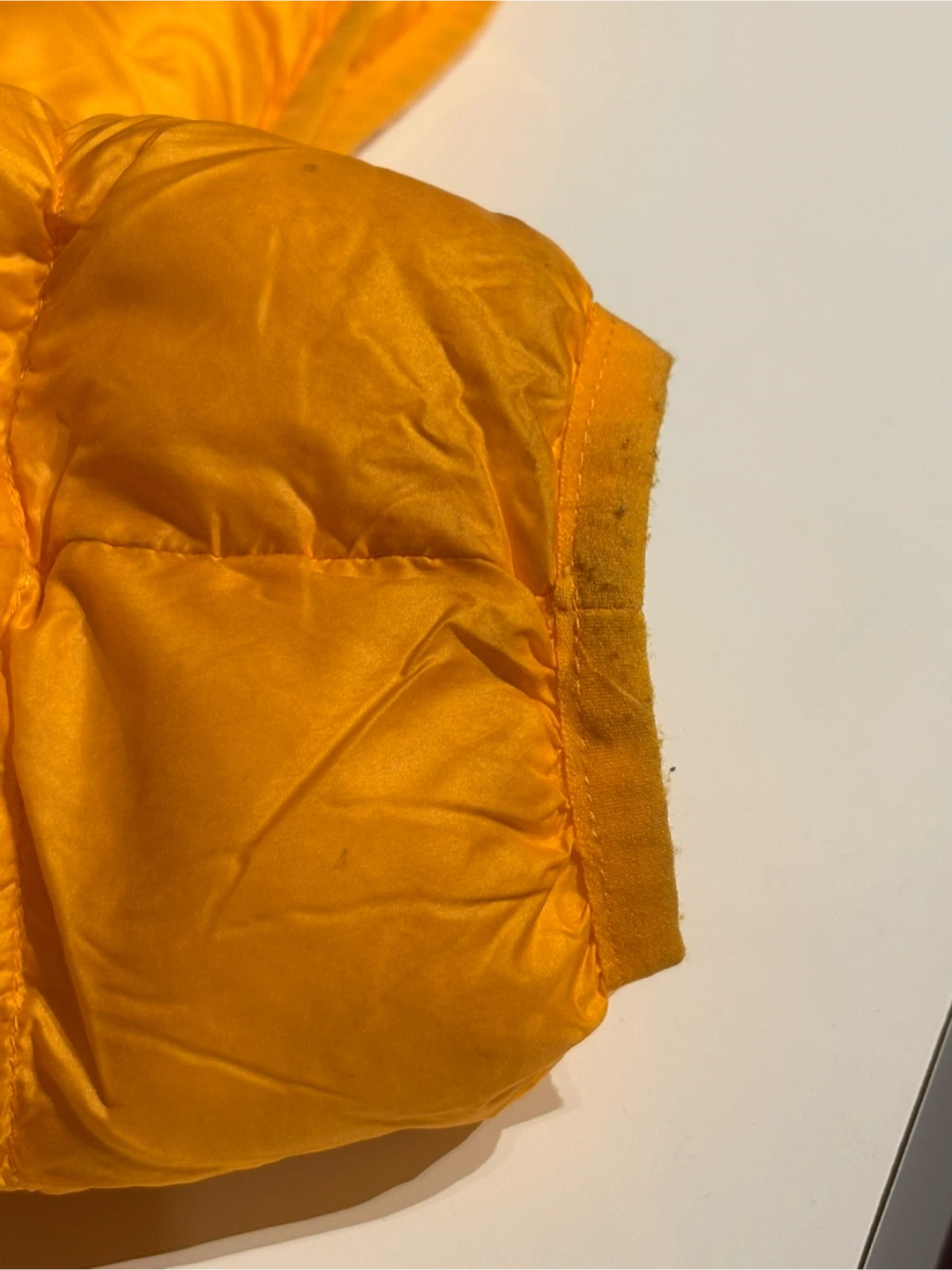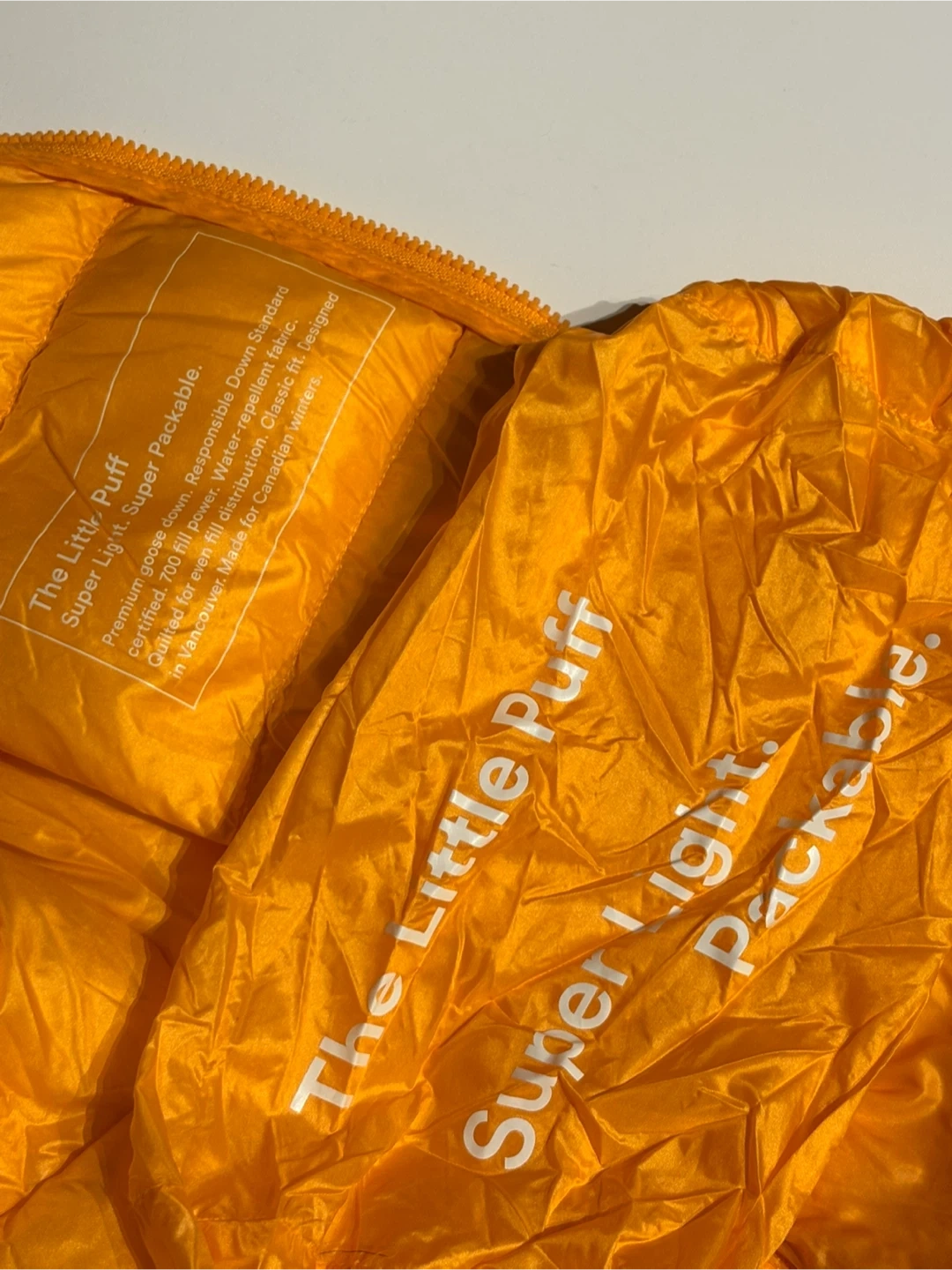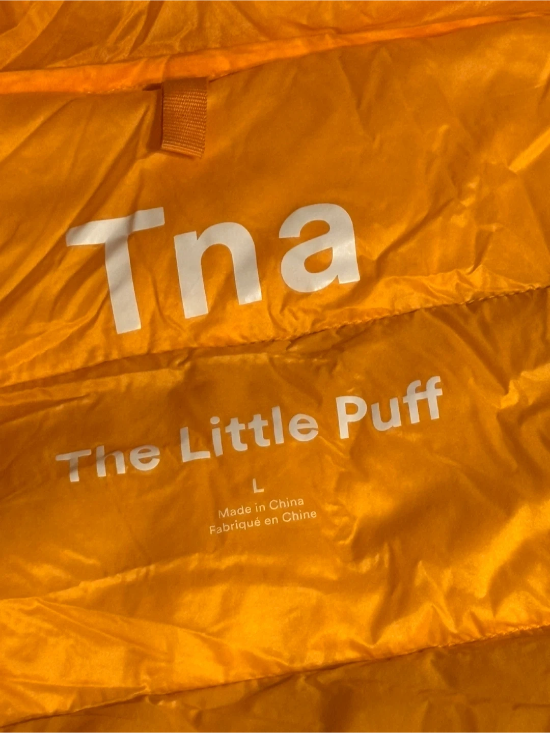 Selling a bright yellow Tna The Little Puff jacket! It's a size large and features premium goose down. This jacket is super light and packable, making it perfect for those on the go. It's quilted for even fill distribution and has a classic fit. The fabric is water repellent and machine washable.