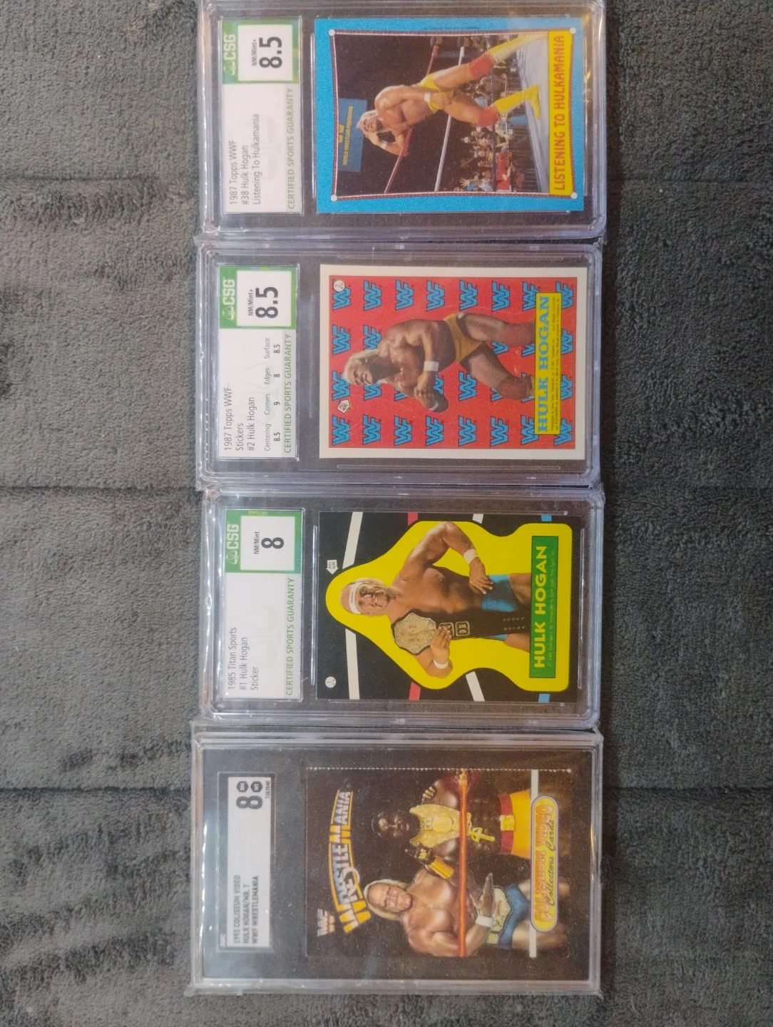 Selling a set of Hulk Hogan WWF trading cards, all graded by CSG! Includes cards from 1985, 1987, and 1993. Great for any wrestling fan or collector