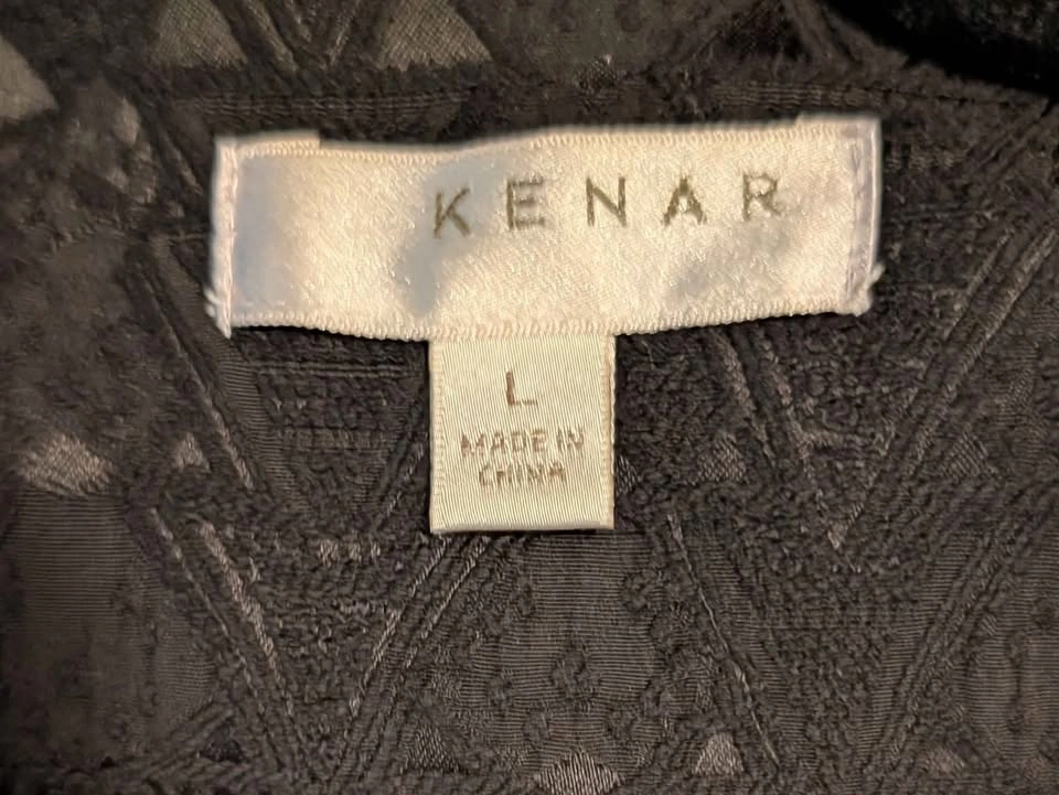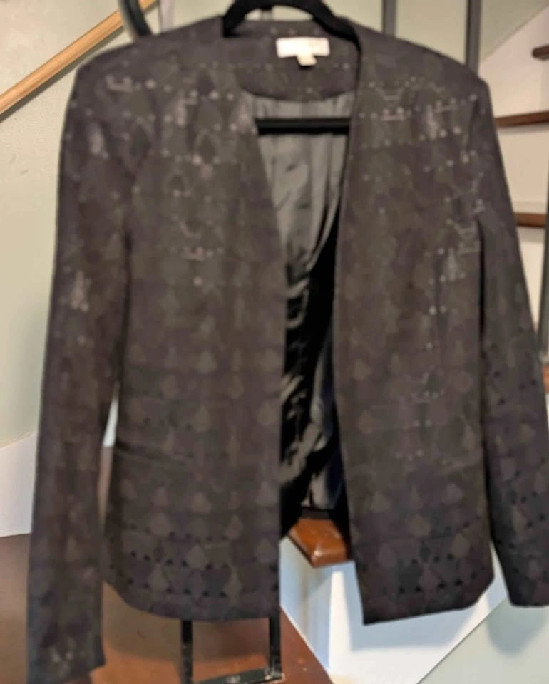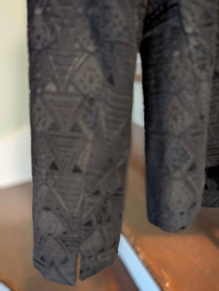 Black, woven, fitted geometric patterned jacket for a classic fit. It is 24" long and approximately 40" across the chest. This is a very versatile wardrobe item.