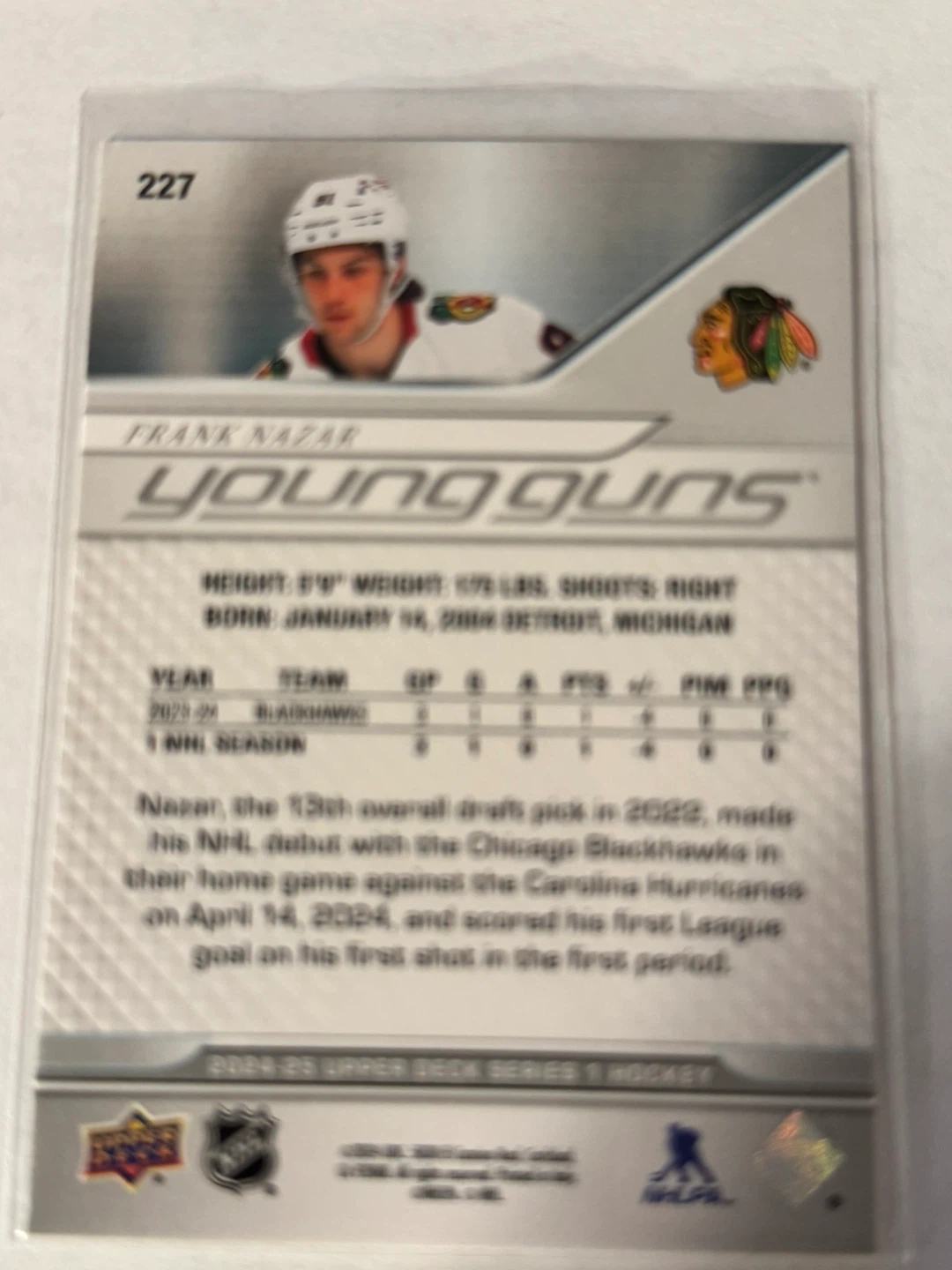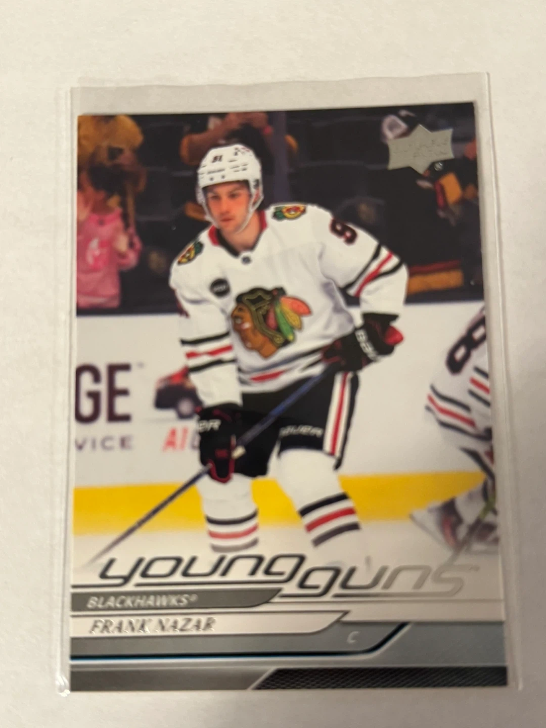 Selling a Frank Nazar Young Guns hockey card. He was the 13th overall draft pick in 2022 and made his NHL debut with the Chicago Blackhawks. He scored his first league goal on April 14, 2024