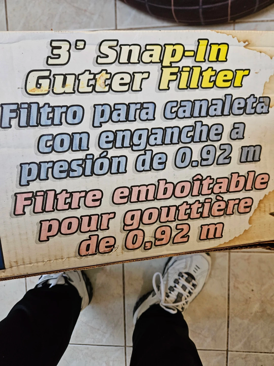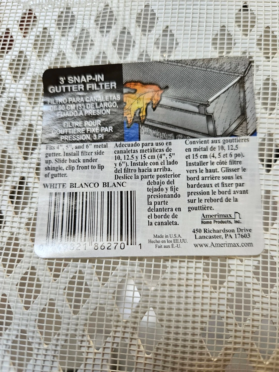 60Selling over 49 - 3' Snap-In Gutter Filter from Amerimax. It fits 4", 5", and 6" metal K gutters. Helps to filter out pine needles and other debris from your gutters. This an in-expensive way of not having to clean out your gutters yearly. Stop having to climb ladders, install it once and forget about it.
