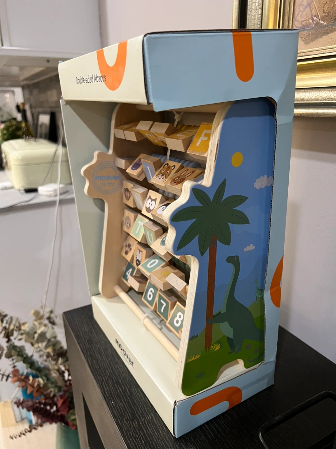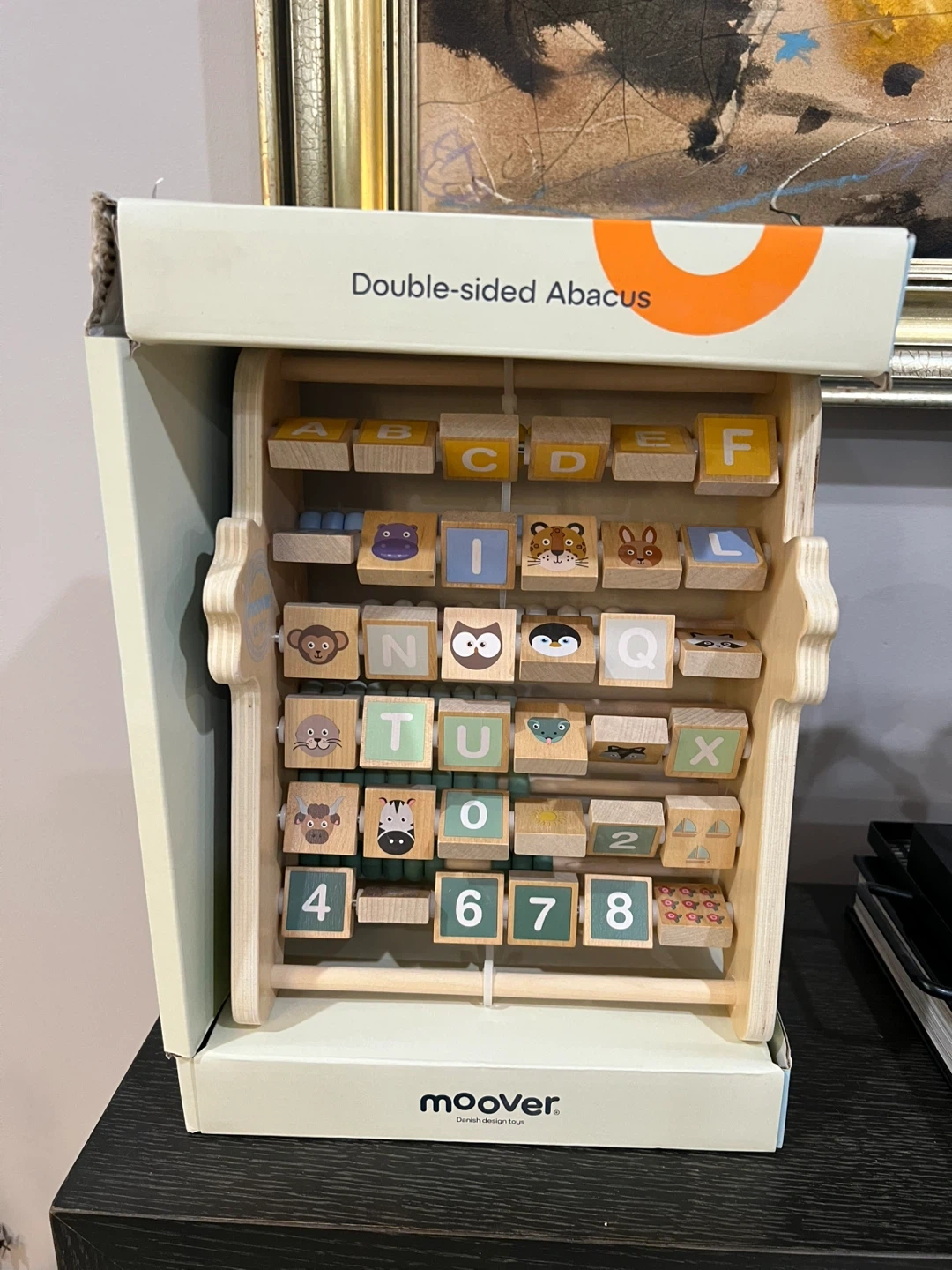 Selling a Moover Double-sided Abacus, a traditional logic toy designed to spark curiosity with rotating letters and numbers! This toy improves children's fine motor skills and colour-shape recognition. Recommended for ages 2-6 years.
