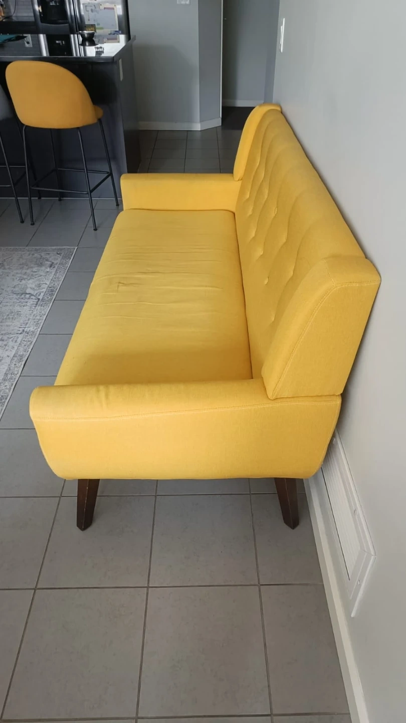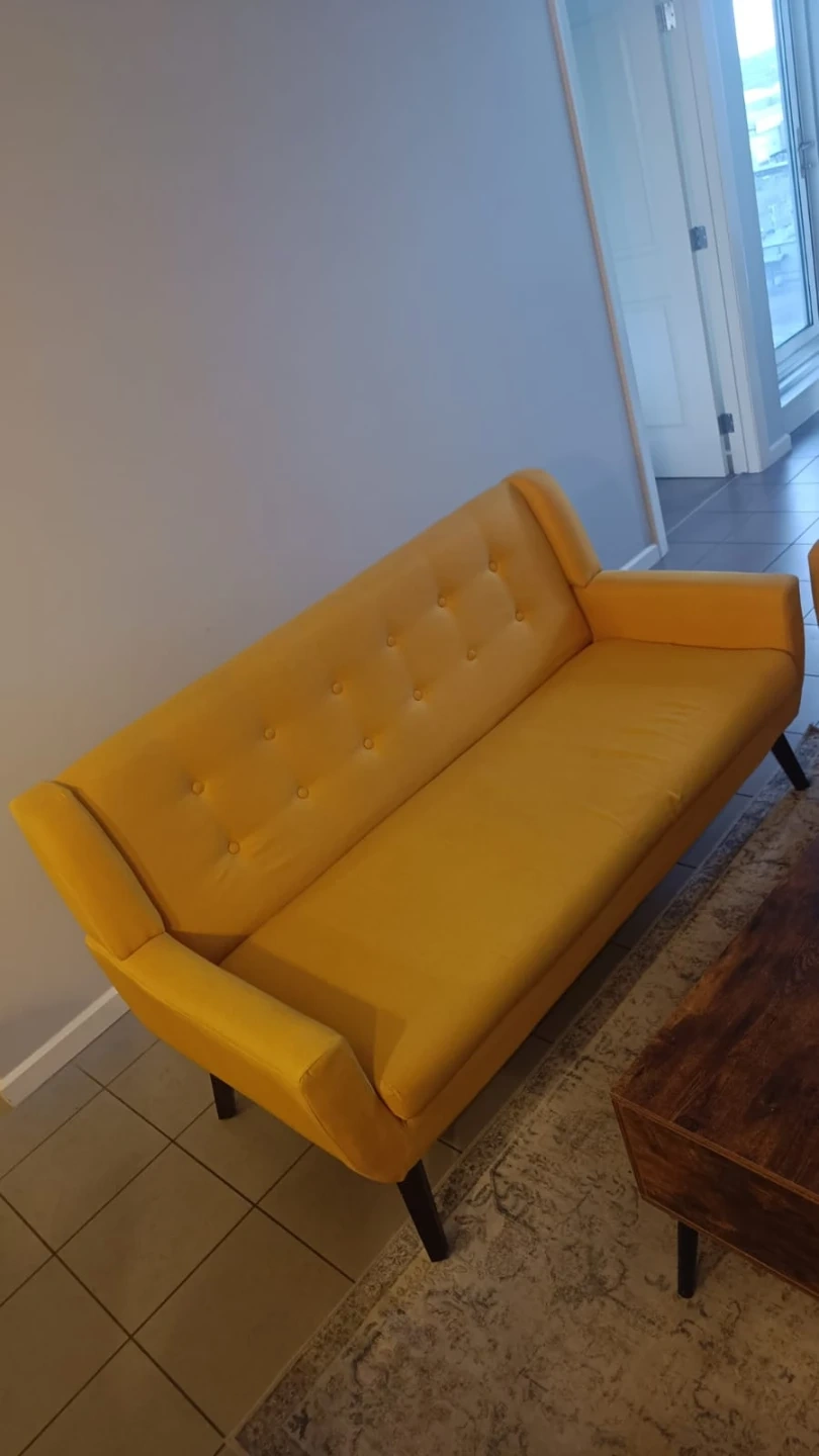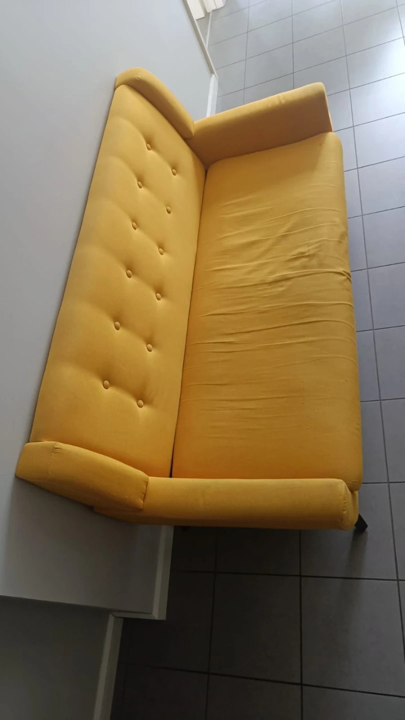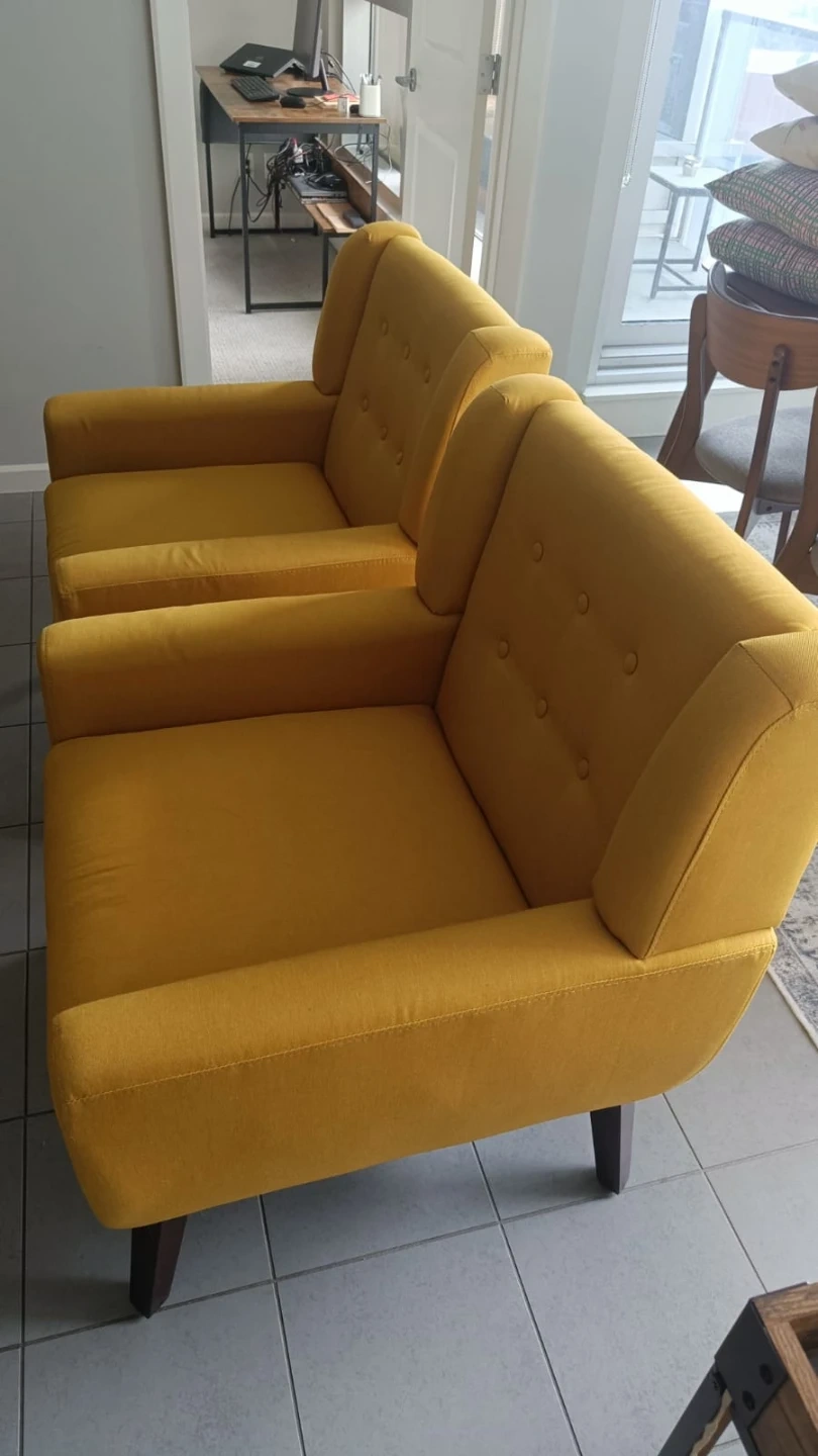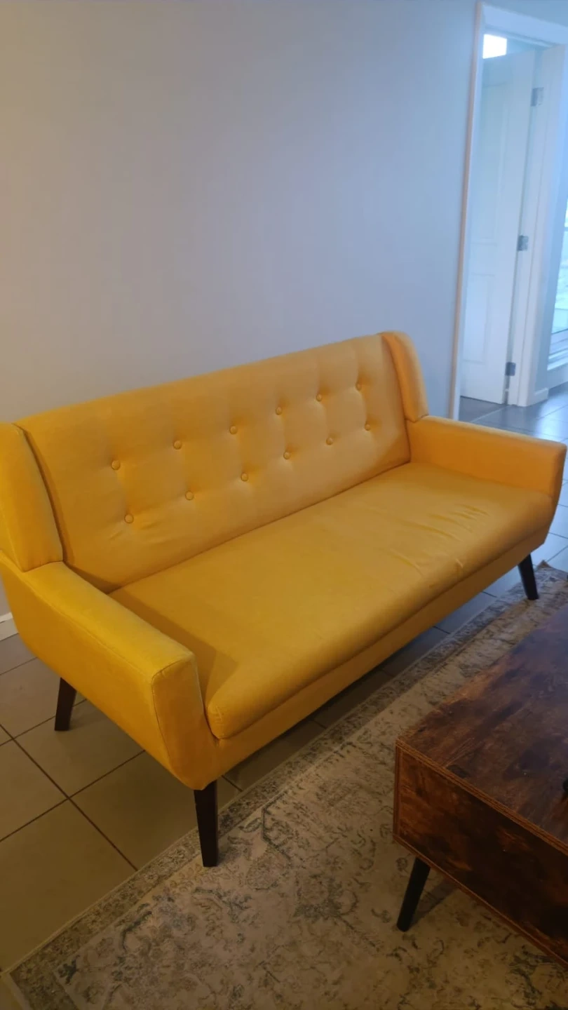 Selling a cute yellow tufted sofa set 2+1! It's in great condition and would be a lovely addition to any living room or den. The yellow color makes the living room vibrant. In good condition with minor daily use wear. Lightweight. 2 single seater. 1 double seater. The protection plan is valid for another 3 years and is transferable. No negotiations preferred as it is still under warranty.