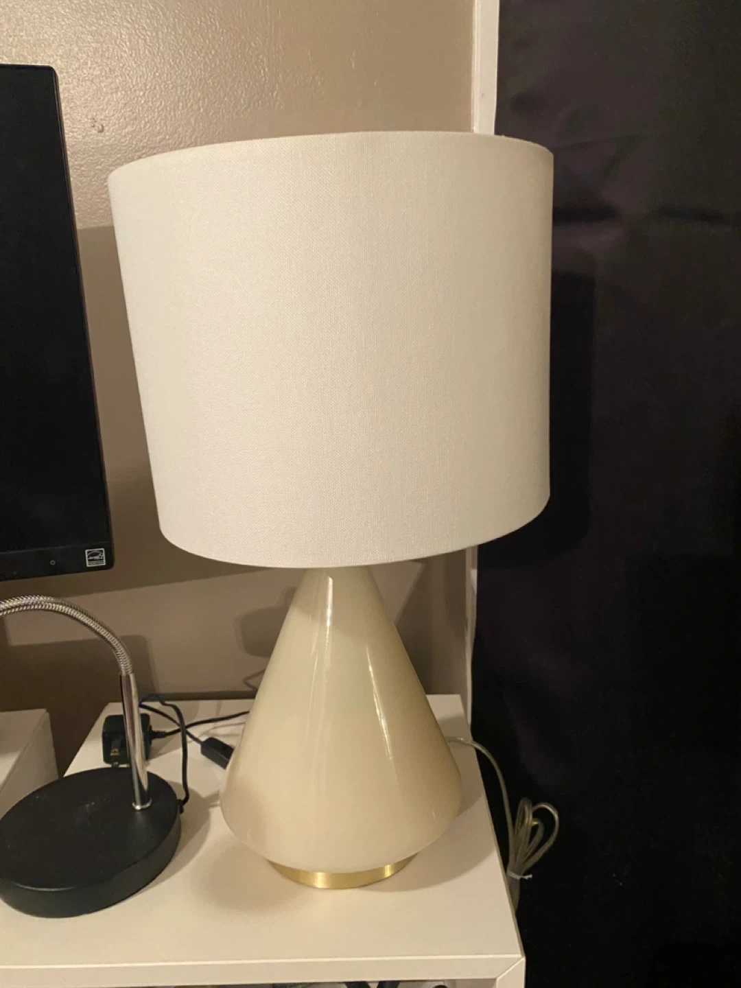 Here's a stylish table lamp featuring a classic white shade and a unique cone-shaped base! It adds a touch of modern elegance to any room. Perfect for bedside tables, desks, or living room accents