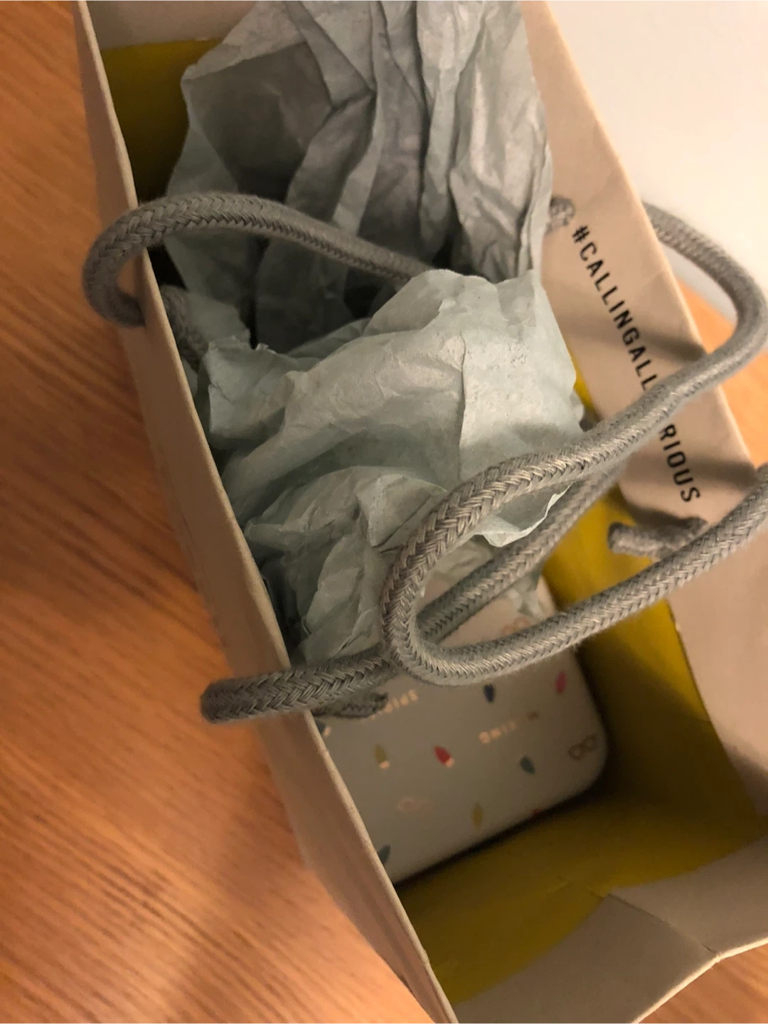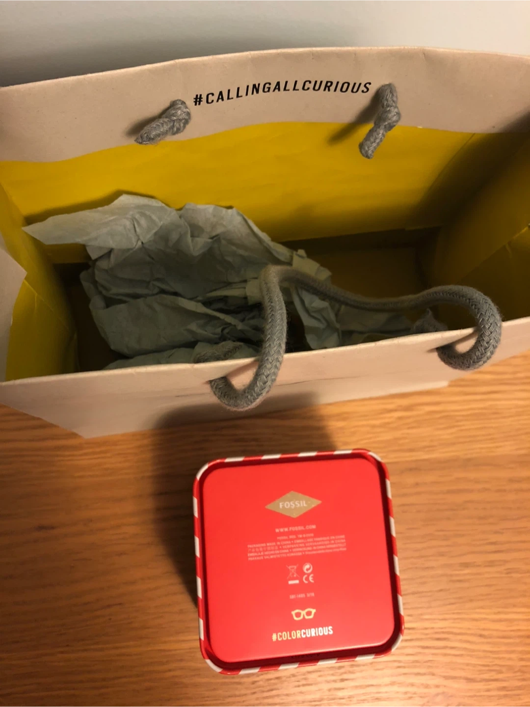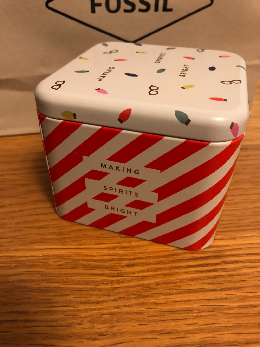 Selling a New Fossil collectible tin. Free with tissue paper and bag. It comes with its original packaging. Great for storing your watch or other small items. The tin features a festive design with the words "Making Spirits Bright."
