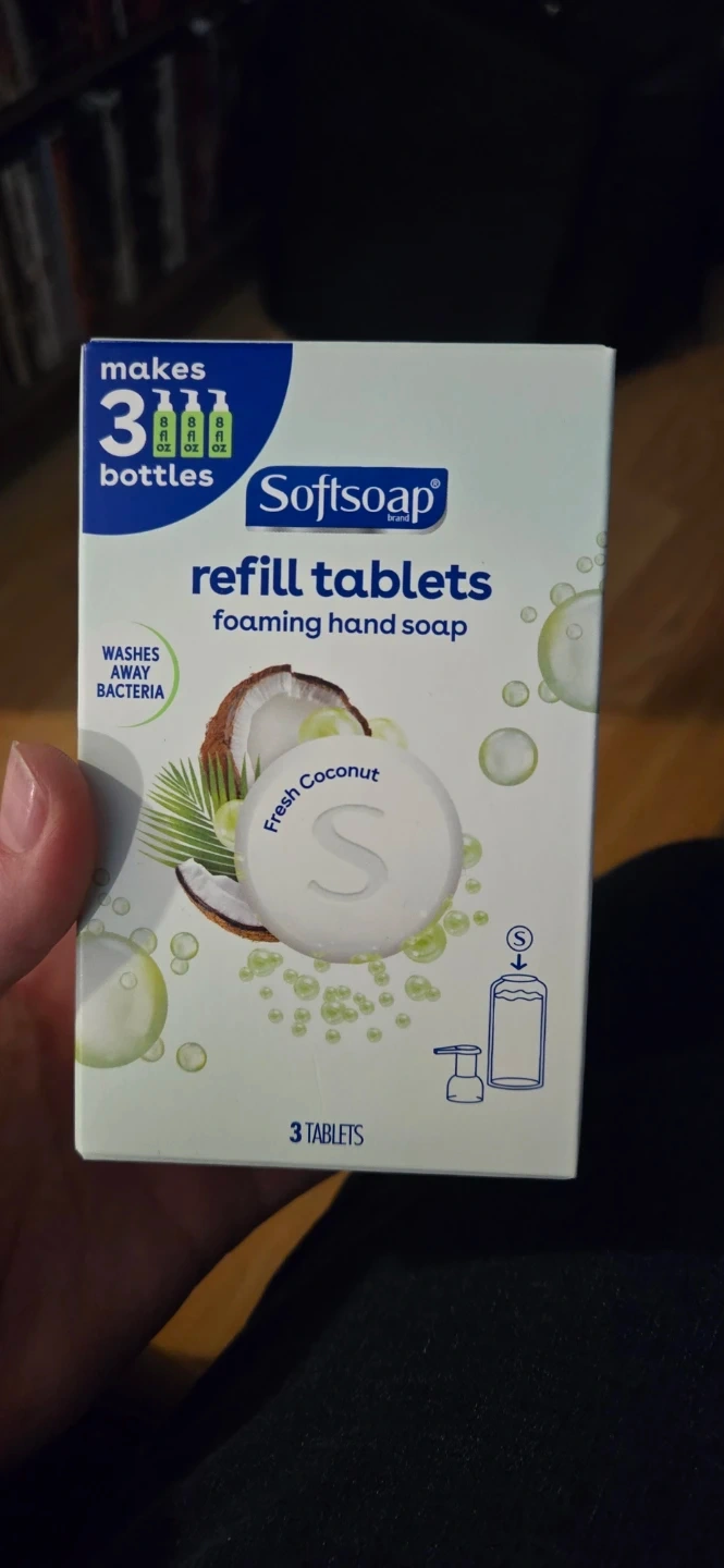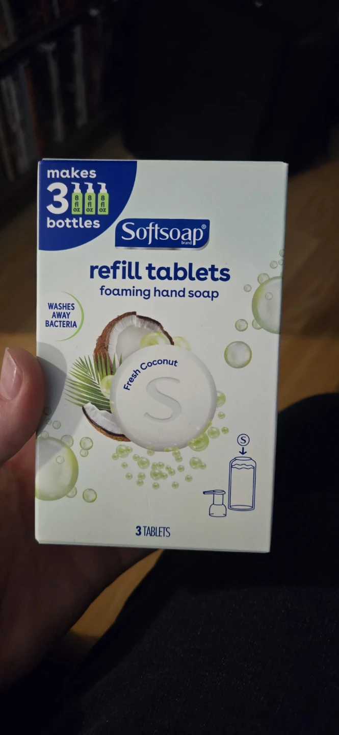 Selling a box of Softsoap refill tablets for foaming hand soap! These are the fresh coconut scent and come with 3 tablets in the box