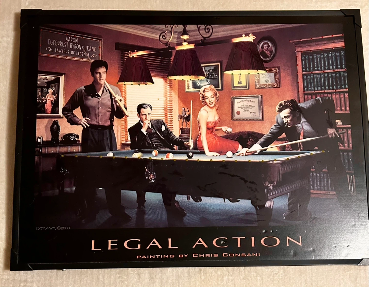 Selling a framed painting titled 'Legal Action' by Chris Consani. It features iconic figures around a pool table. A unique piece for any art or pop culture enthusiast!