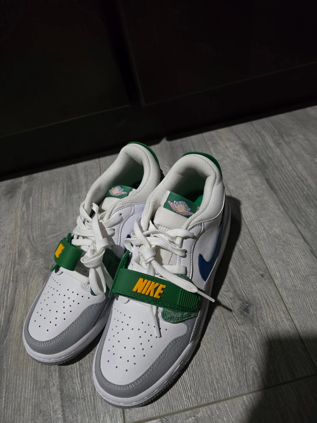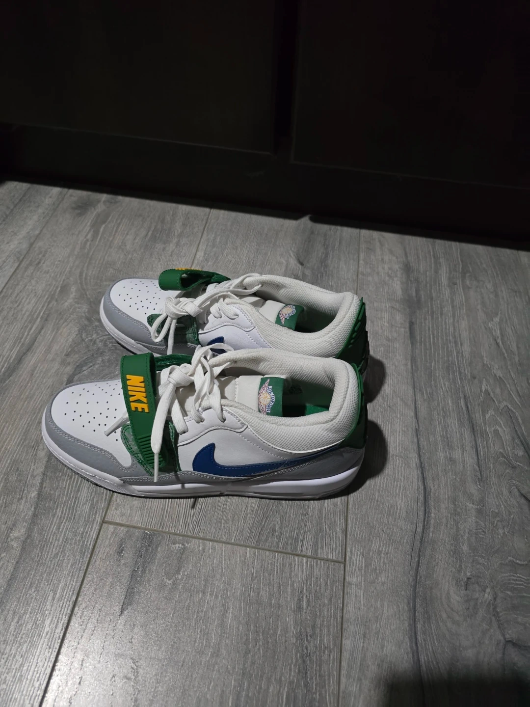 60Selling a pair of Nike Air Jordan Trainer ST G golf shoes! They feature a white, green, and grey colour scheme with a blue swoosh. Great for hitting the links in style!