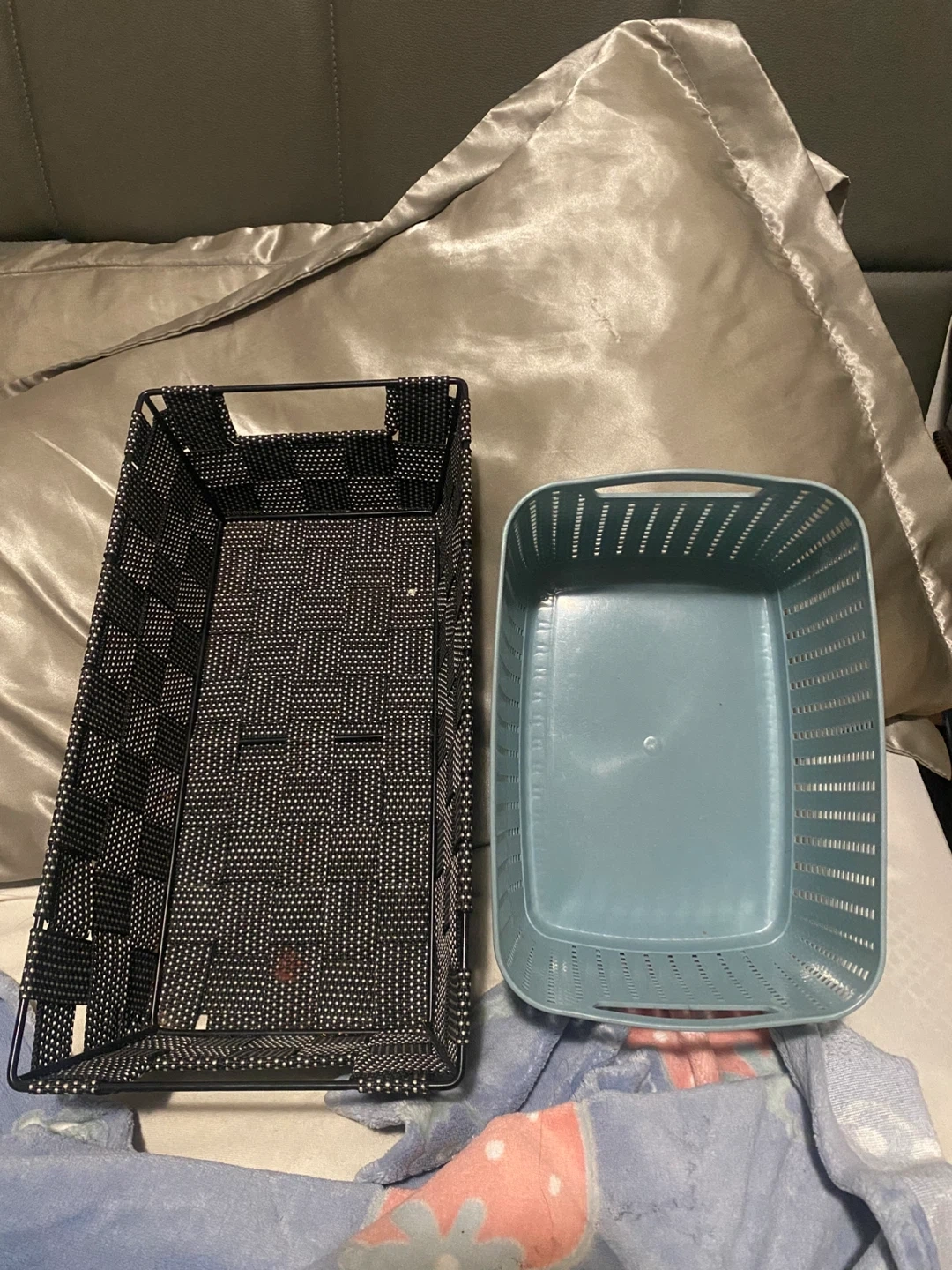 Two storage baskets are available. One is a light blue plastic basket with handle cutouts. The other is a taller black metal basket with a woven pattern.