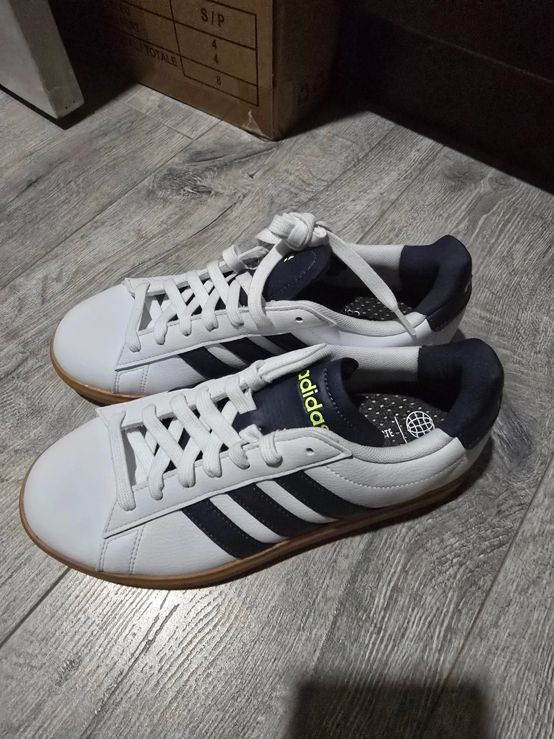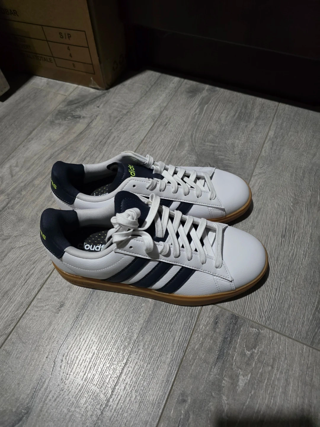 60Selling a pair of Adidas Cloudfoam Comfort sneakers. They are white with navy blue stripes and accents. The insole features Cloudfoam technology for extra comfort. Great for everyday wear!