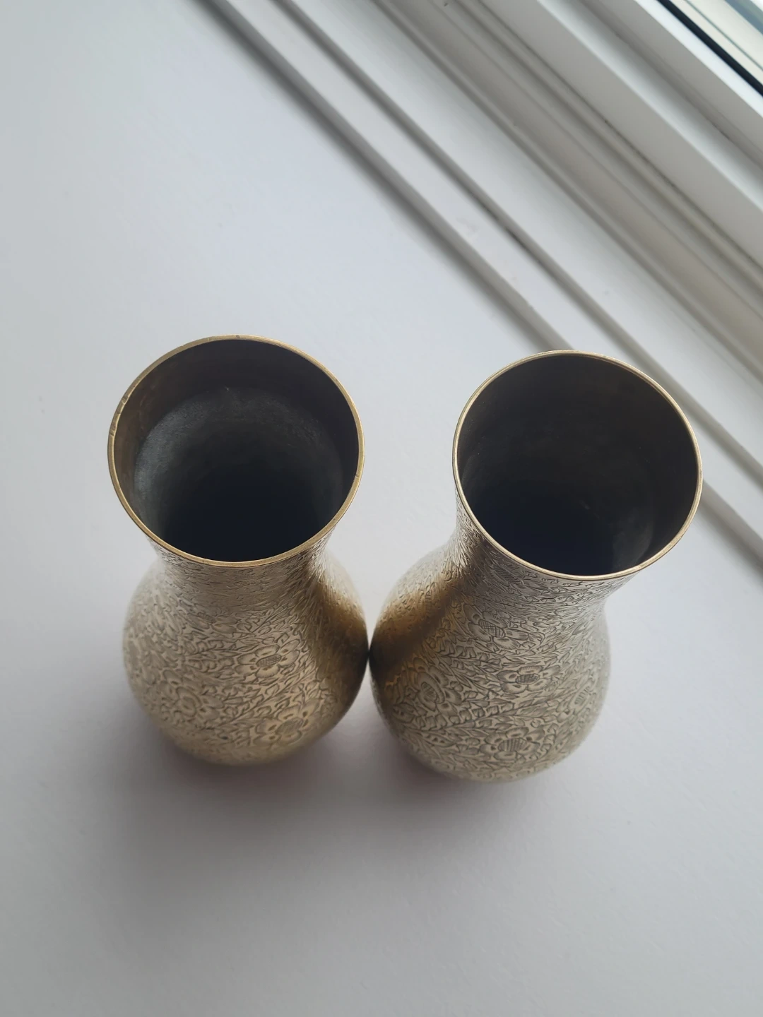 Add a touch of elegance to your home with these stunning etched floral brass vases! Standing at 10 inches tall, these vases feature intricate floral designs and a beautiful golden brass finish. They are in good condition, ready to display your favourite blooms or stand alone as decorative pieces.