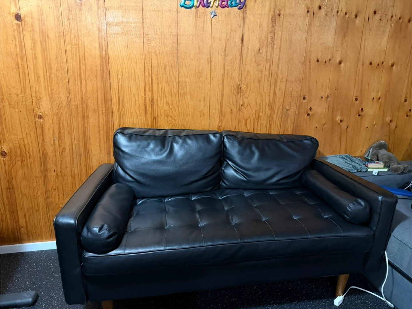 Selling a black leather loveseat sofa. It's in good condition and would be a great addition to any living space. Perfect for small apartments or cozy rooms!