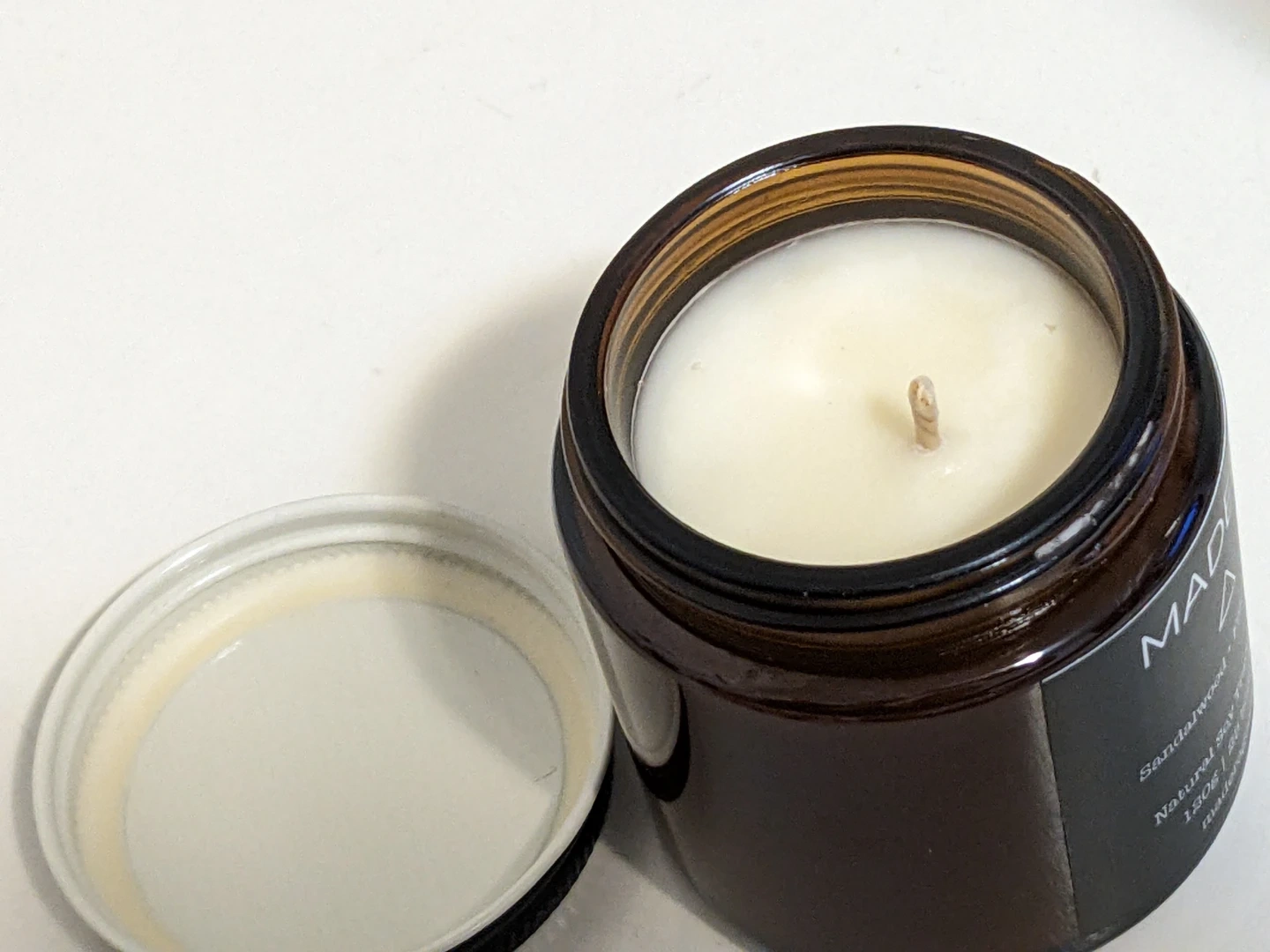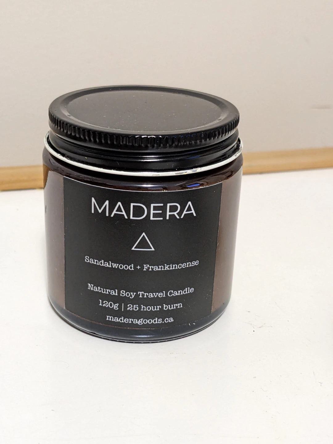 Selling a Madera natural soy travel candle. It's scented with Sandalwood and Frankincense. The candle weighs 120g and has a 25 hour burn time