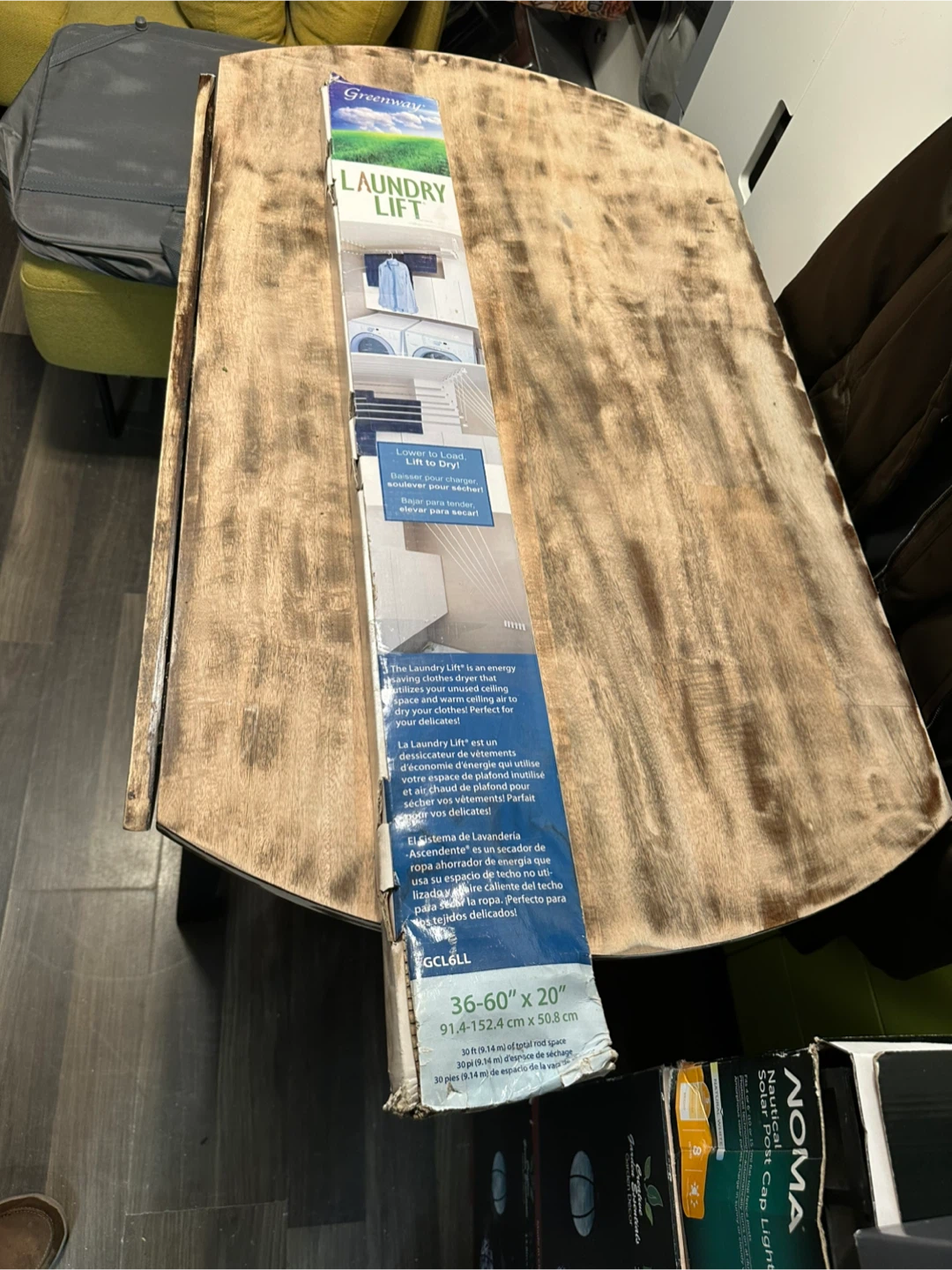 Selling a Greenway Laundry Lift, sized 36-60" x 20". It's designed to save space and warm ceiling air to gently dry your delicates. The box includes all the necessary components for installation