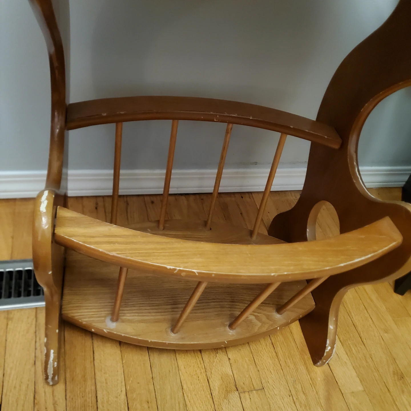 Selling a vintage wooden side table with a built-in magazine rack! It has a charming, classic look that would fit nicely in a living room or reading nook. It has some wear and tear, but is still sturdy and functional. The top is 23.5"( inches) by 15.75". The height is just short of 22".