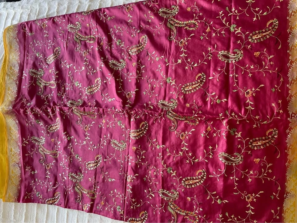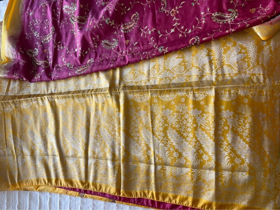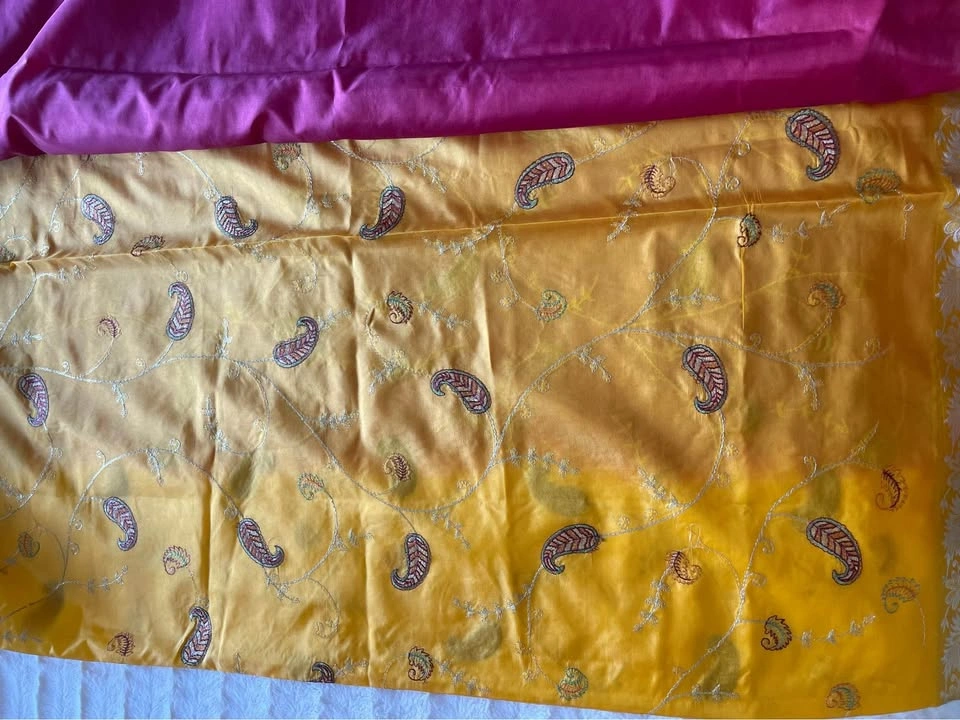 Maroon silk one is 2 toned. Maroon and yellow embroidery work all over