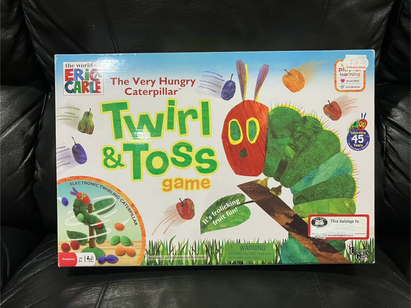 60Selling The Very Hungry Caterpillar Twirl & Toss game! It's an electronic twirling caterpillar game suitable for preschool ages 3+. It helps with social skills and coordination. This game was originally bought for $34.99. Requires 2 AA batteries (not included)