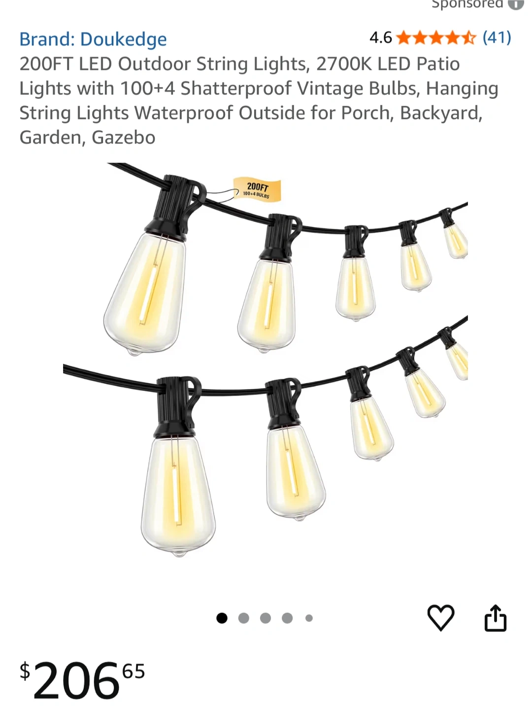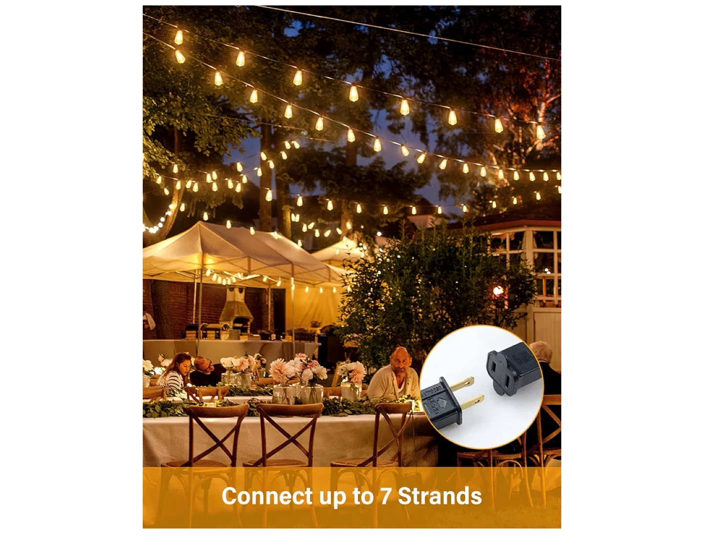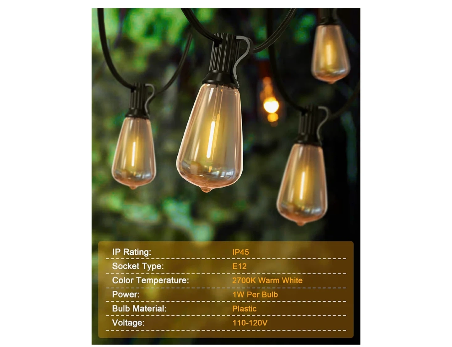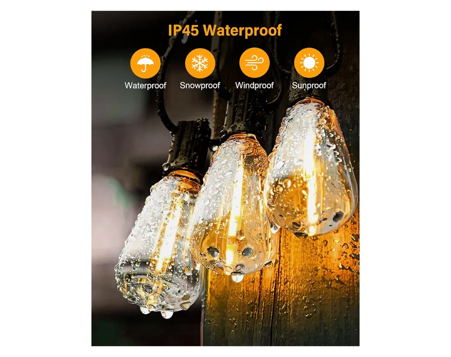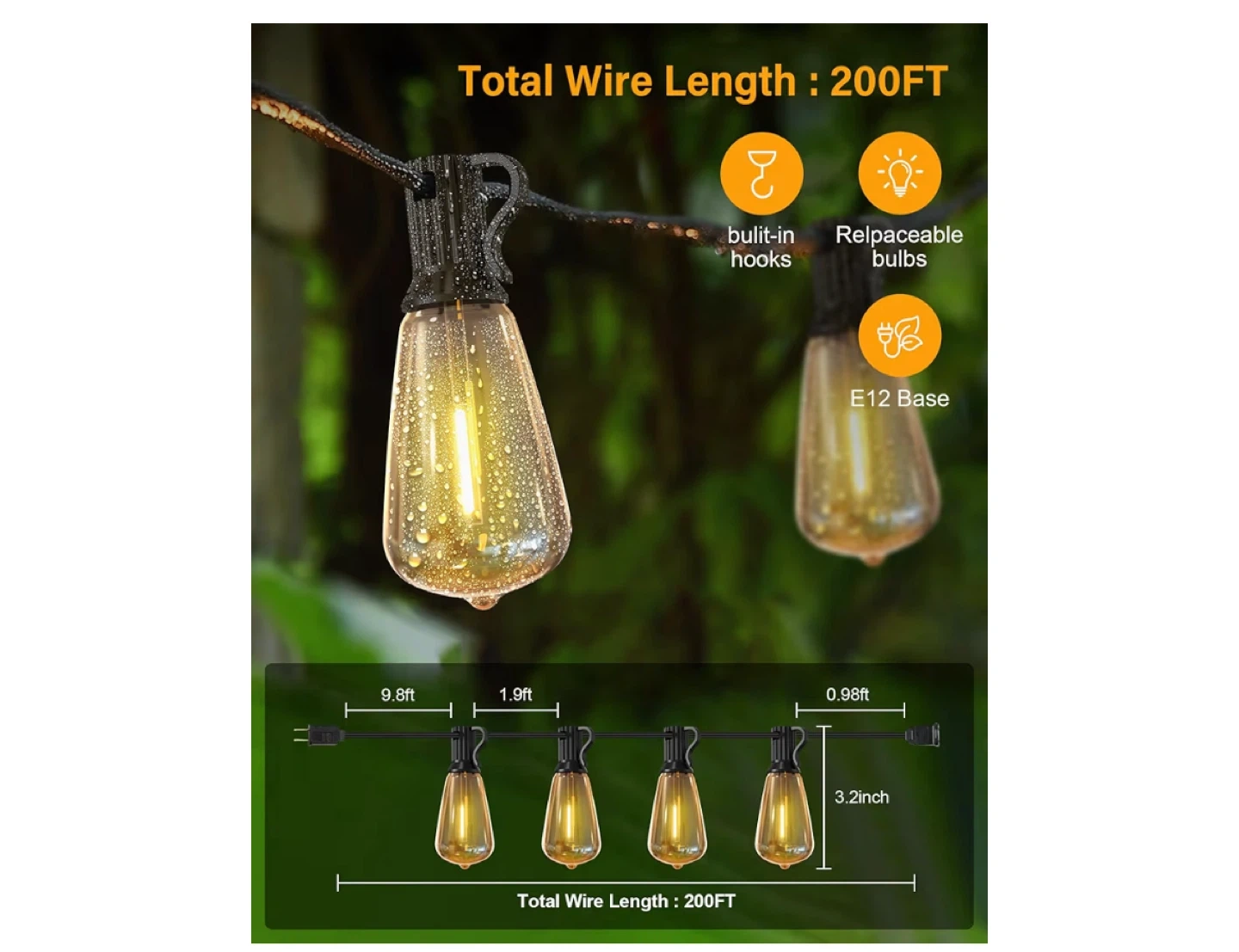 63These Doukedge LED outdoor string lights are perfect for creating a warm and inviting atmosphere in your backyard, garden, or patio! They feature 100+4 shatterproof vintage bulbs and have a total wire length of 200FT. They're also waterproof, snowproof, windproof and sunproof. The bulbs are replaceable and have an E12 base. They emit a 2700K warm white light and use only 1W per bulb.