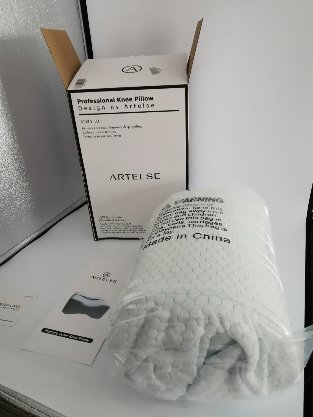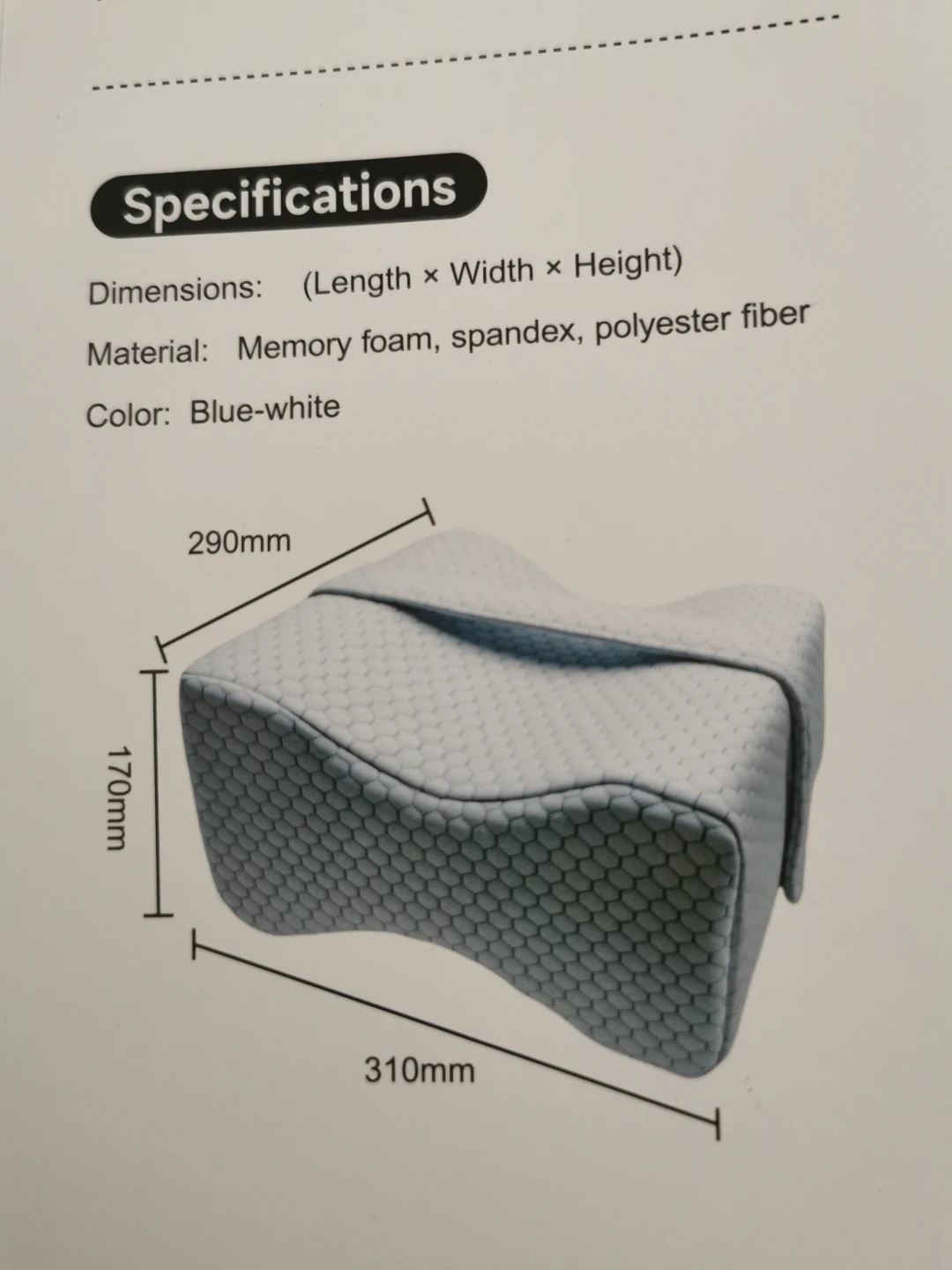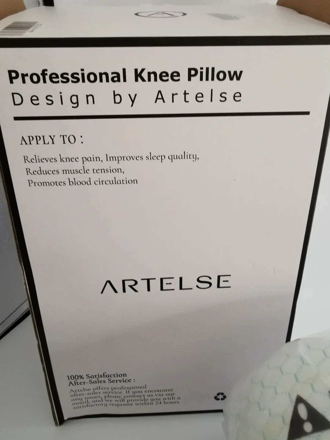 I'm offering a brand new Artelse Professional Knee Pillow designed to relieve knee pain, improve sleep quality, reduce muscle tension, and promote blood circulation. The pillow is made of memory foam, spandex, and polyester fibre with a blue-white colour scheme.