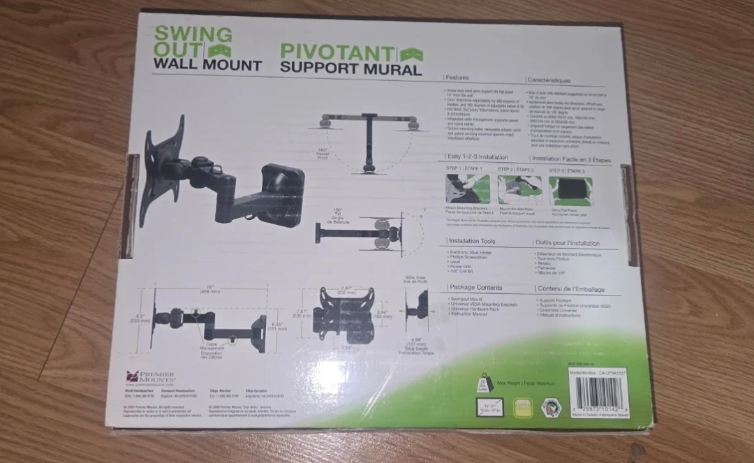 88Selling a Premier Mounts swing out wall mount, model CA-LPSA1317. It fits most 10"-37" flat panel TVs and extends 14" from the wall. Easy to install! Includes universal VESA mounting brackets and all essential hardware for installation