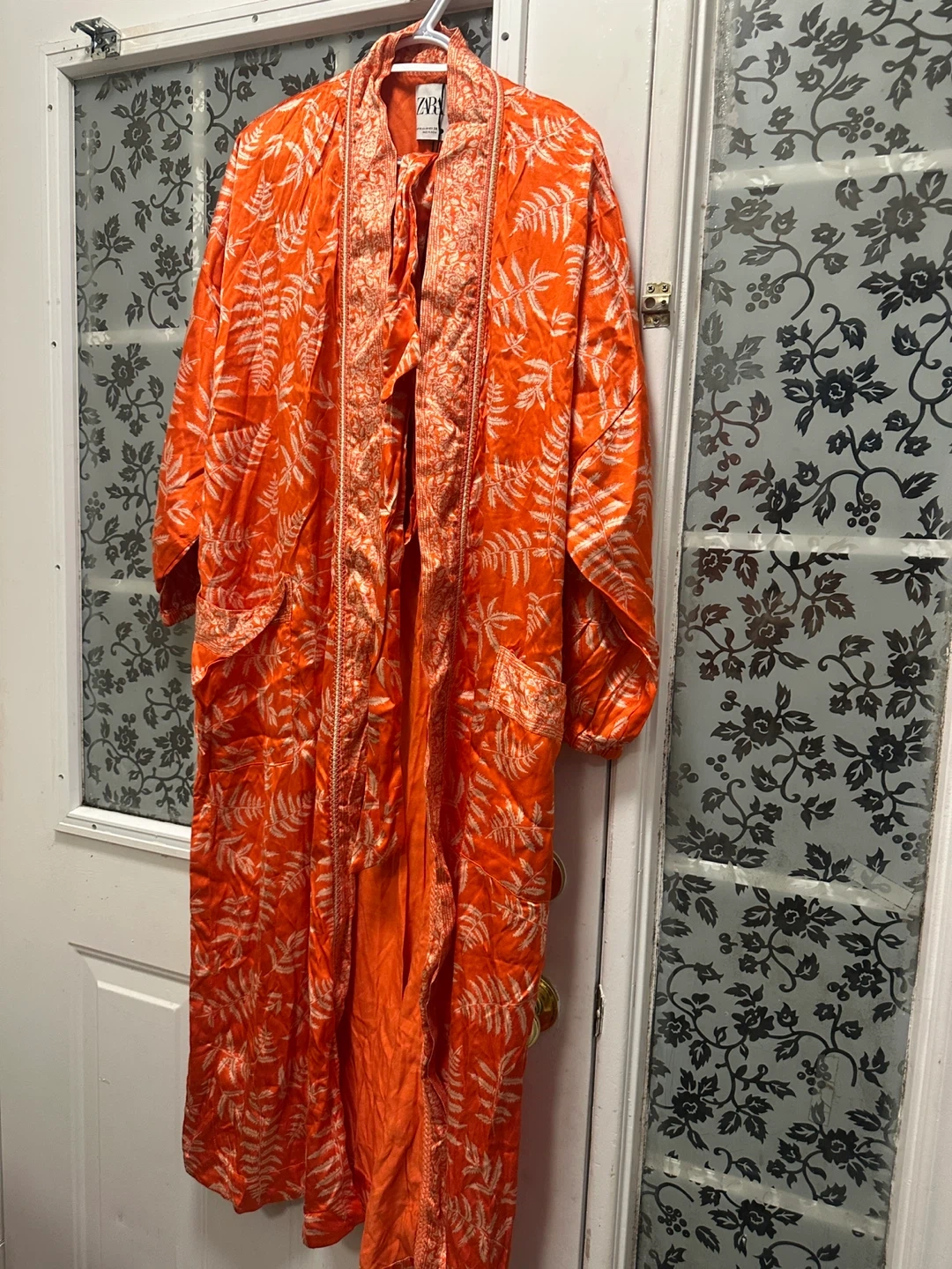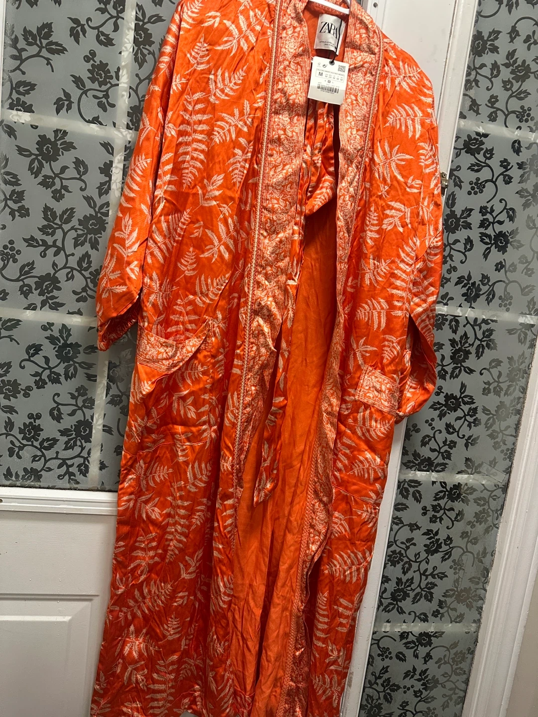 83Brighten up your wardrobe with this vibrant orange kimono from Zara! It features a beautiful white floral print and comes in size M. Perfect for adding a pop of colour to any outfit