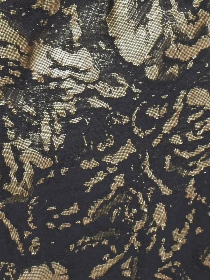 Zipper closure. Really cool 1 piece, but looks like 2 pieces. Metallic gold floral motive on black.