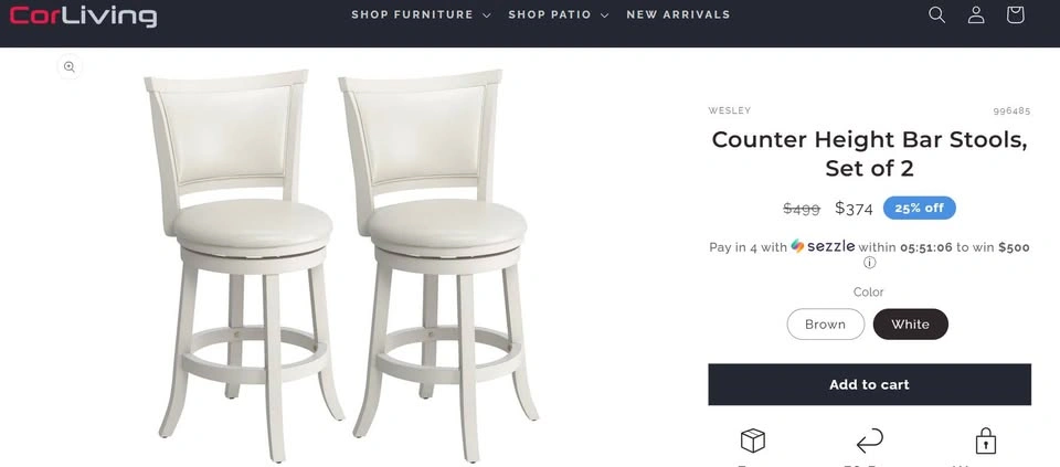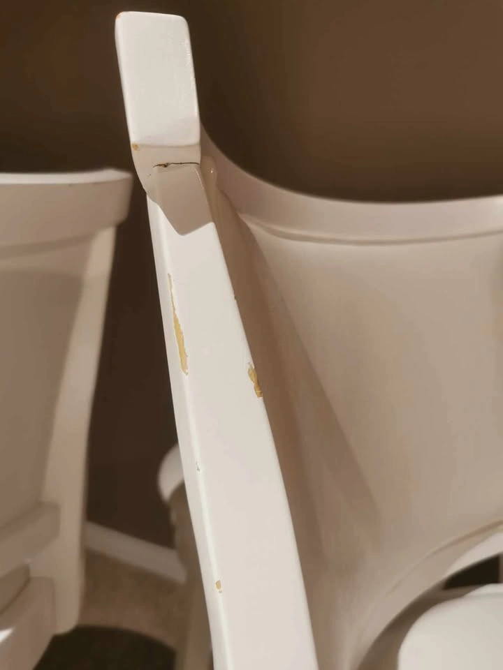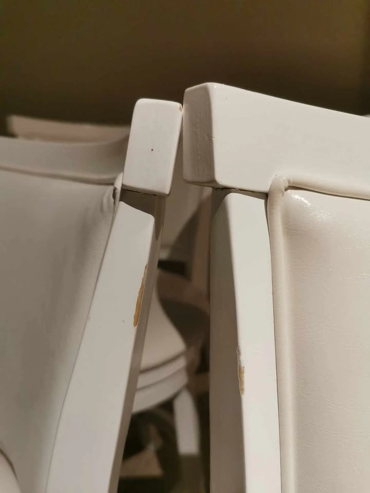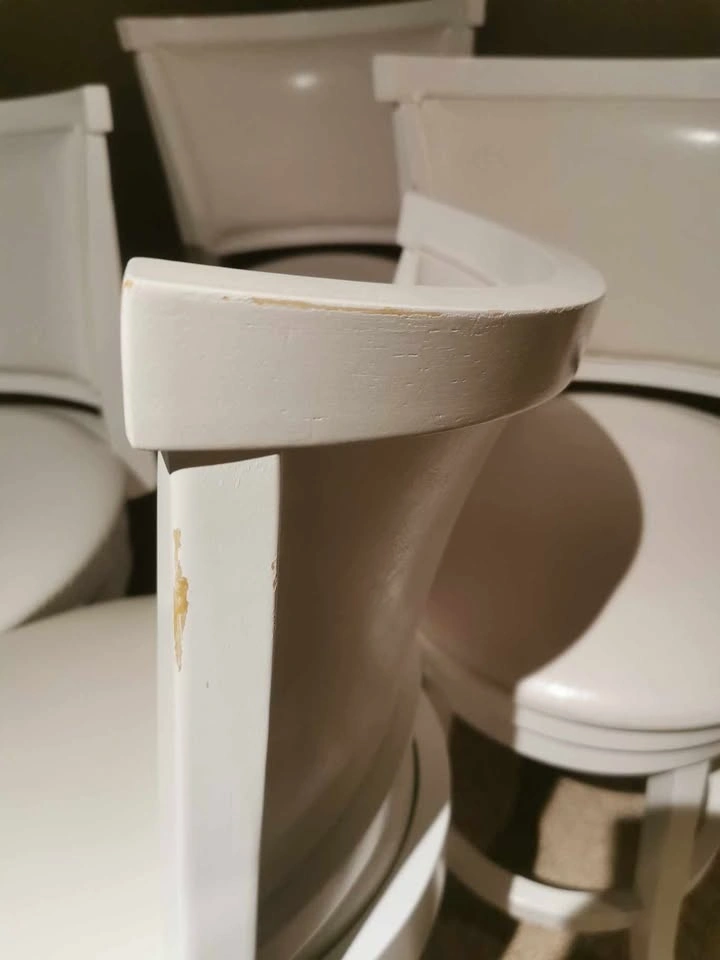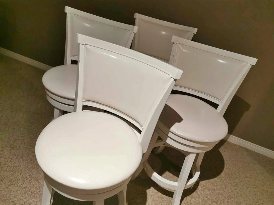 15Paint chips from being used a few years shown in photos, but otherwise excellent condition and faux leather areas look new, free from any rips. $400 total for set of 4 or $120 each. Excellent quality counter height barstools. Heavy solid wood, painted white. White faux leather upholstered padded back and seat. Swivels. Height not adjustable. Bought from Wayfair, where you can see more details: https://www.wayfair.ca/furniture/pdp/three-posts-catt-swivel-bar-counter-stool-c001569699.html Last pic is screenshot from supplier website, where it's on sale for $374 + tax for set of 2 Accept e-transfer or cash. Pet and smoke free home.