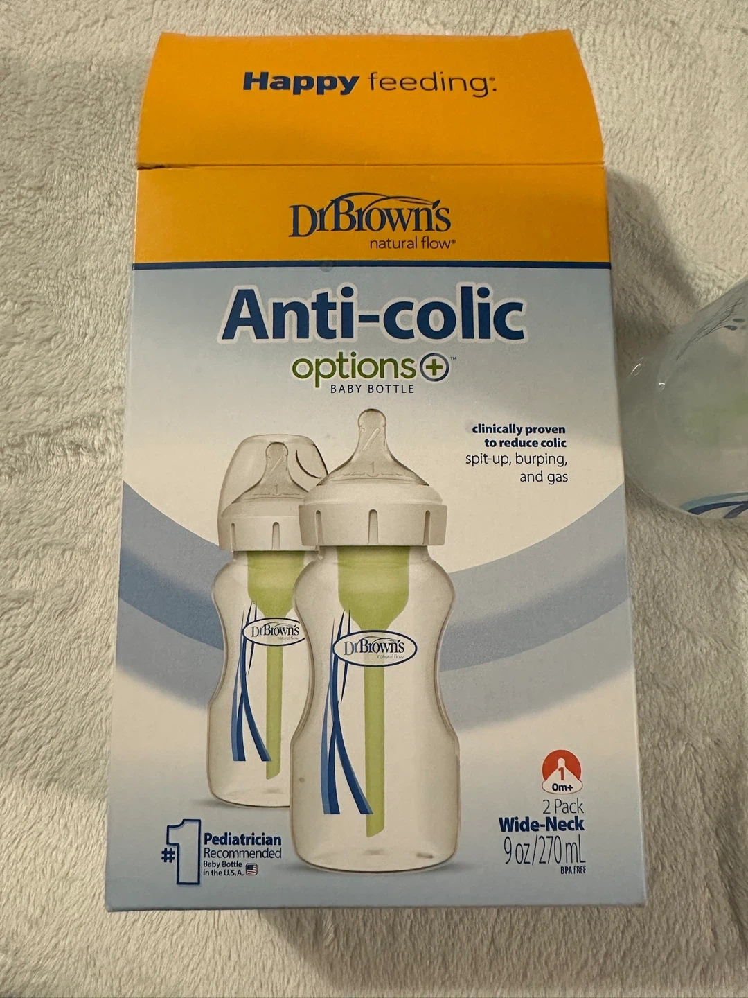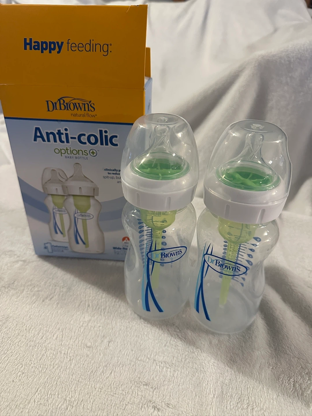 Never used. Selling a set of Dr. Brown's Anti-Colic Options+ baby bottles. They are wide-neck and each bottle holds 9oz/270mL. Recommended for ages 0m+. Comes with the original box!