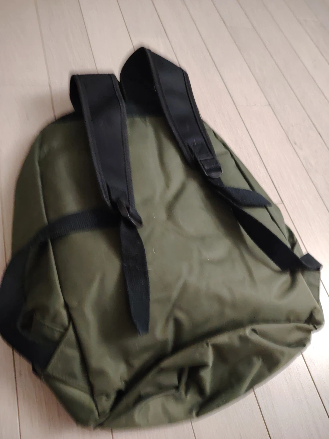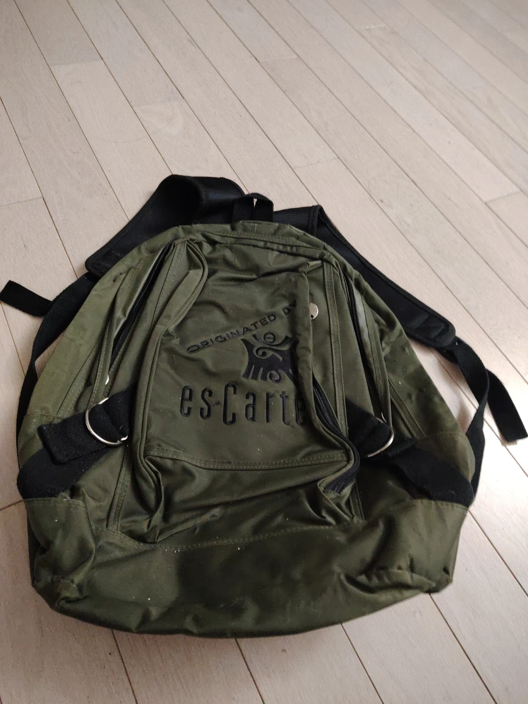Here's an es-Carte backpack in olive green! It's a great backpack for everyday use and has a unique design on the front