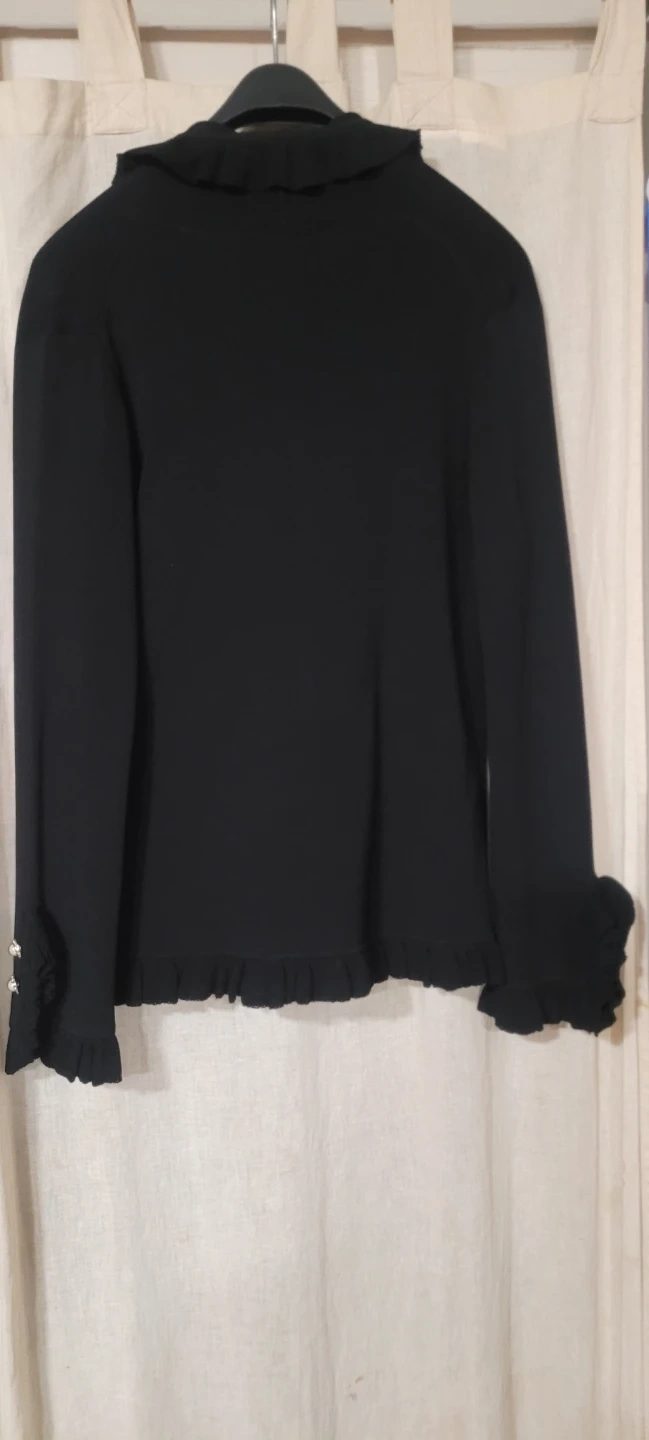 Selling a lovely black cardigan from Vertigo Paris! It features a unique ruffle trim and rhinestone pearl on silver button details. Perfect for layering or wearing on its own!
