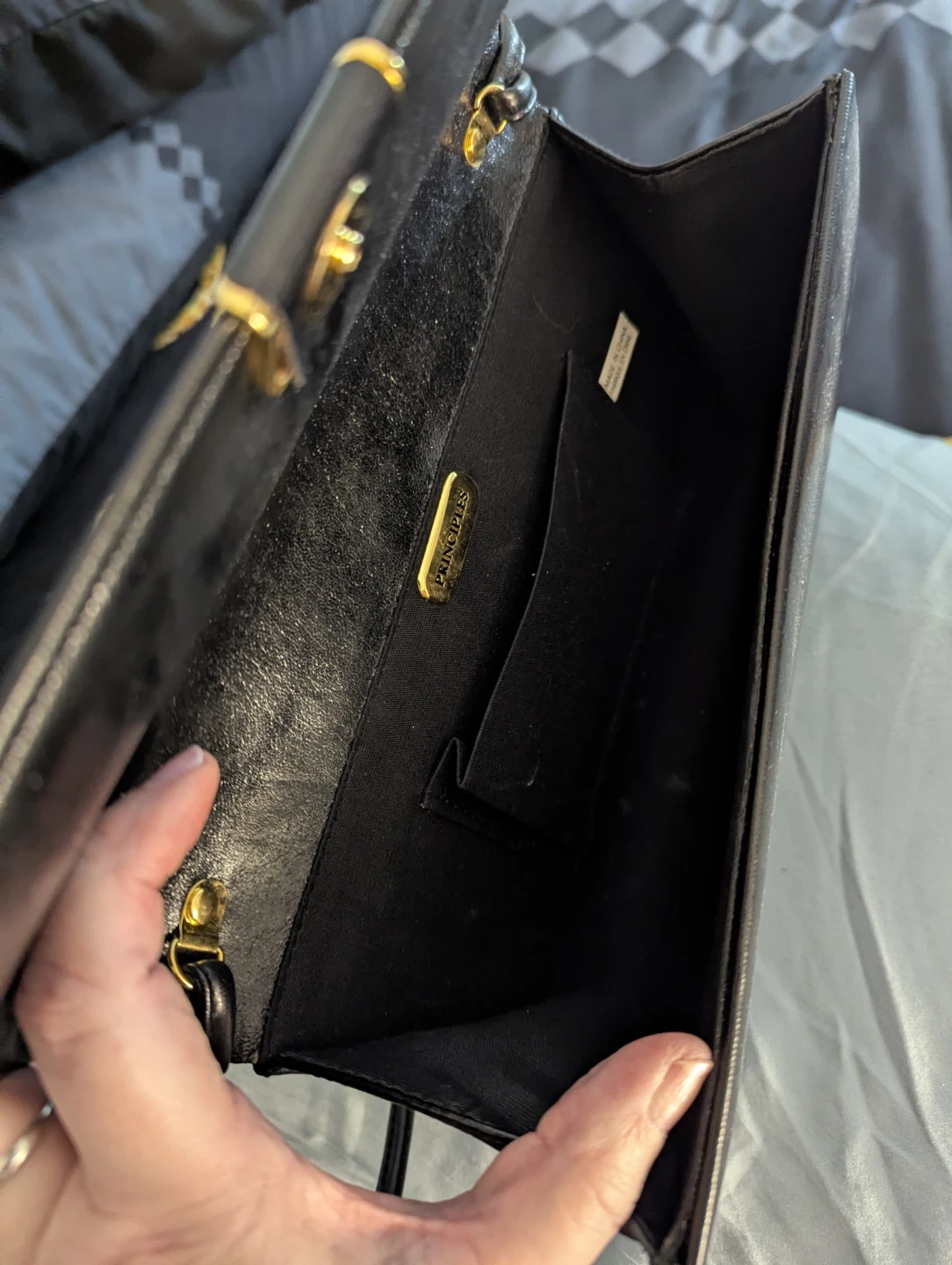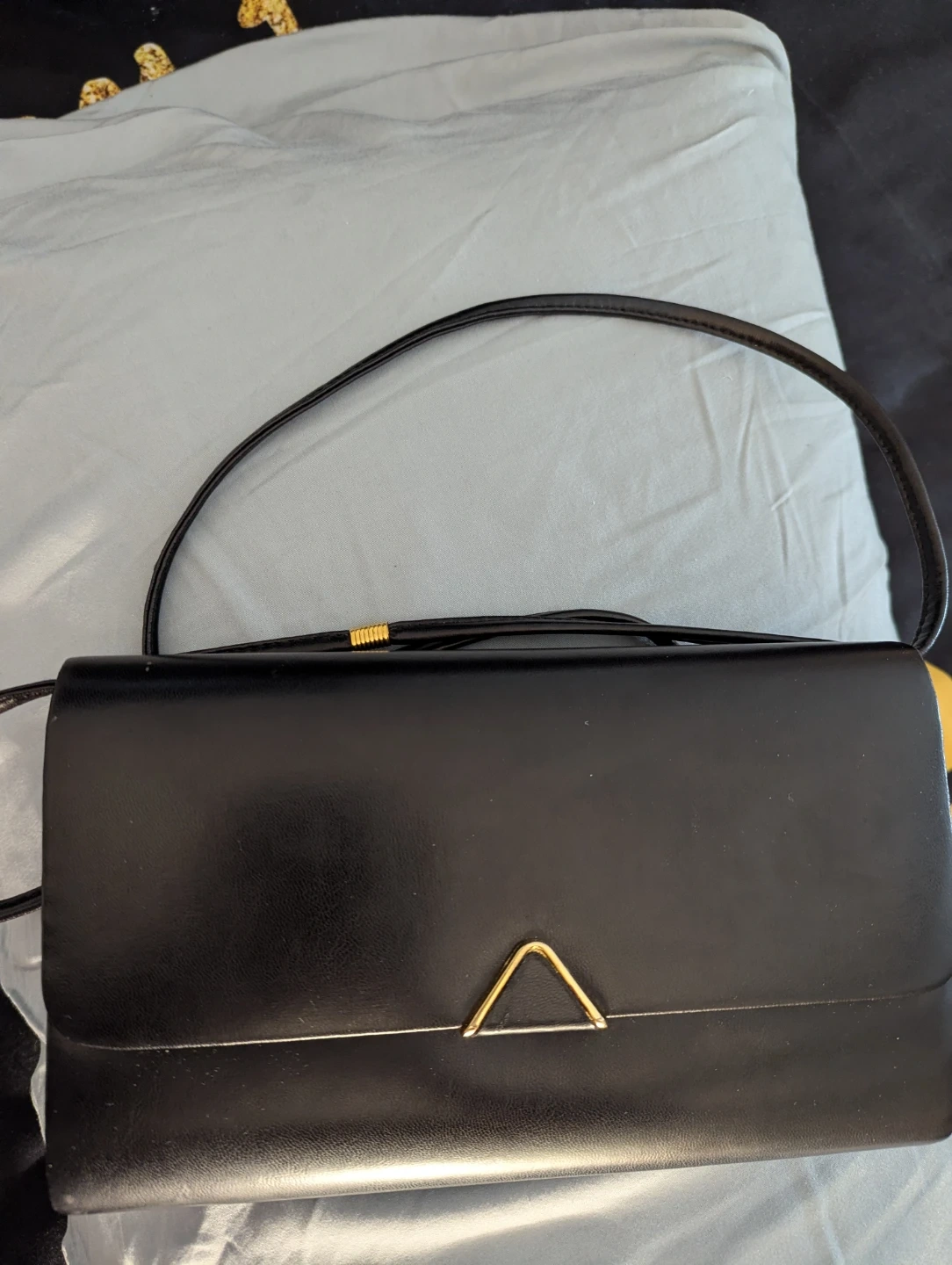 Selling a classic black clutch purse from Principles! It's in great condition and perfect for evenings out or special occasions. The simple design with the gold triangle detail adds a touch of elegance.