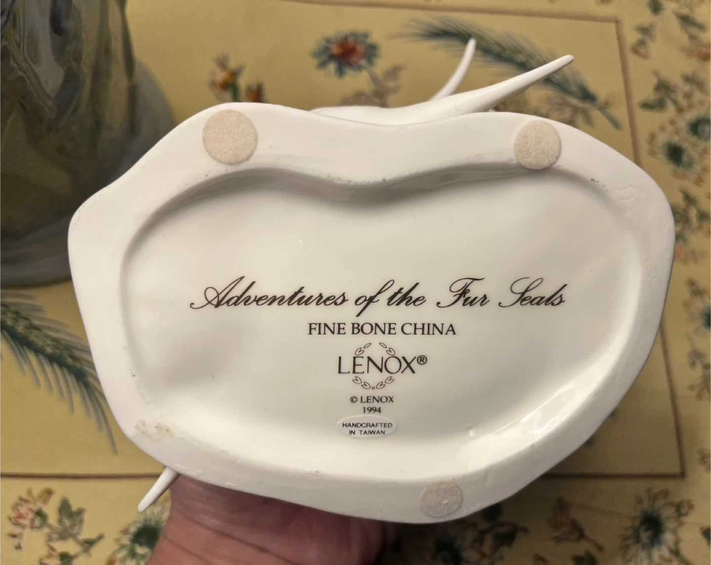 This figurine is the "Adventures of the Fur Seals" sculpture by Lenox, crafted from fine bone china.