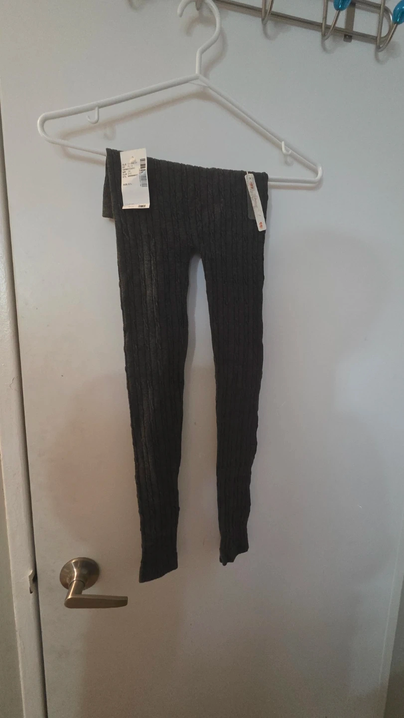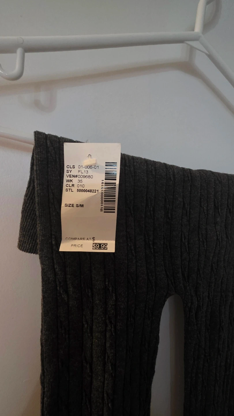 Selling a pair of FLA leggings in grey, size S/M! The leggings have a stylish cable knit design. The tag shows a price of $9.99.