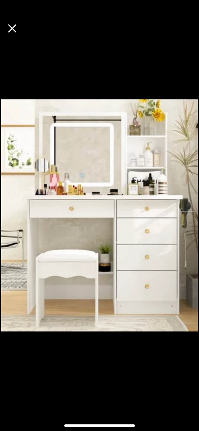 Selling a beautiful white vanity table that includes a mirror and stool! It's in great condition and would be a lovely addition to any bedroom or dressing area. The vanity features drawers for storage and a sleek, modern design. If you're looking for a stylish and functional vanity, this is the perfect set!