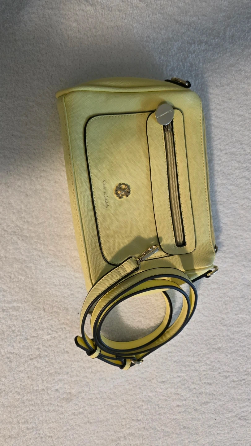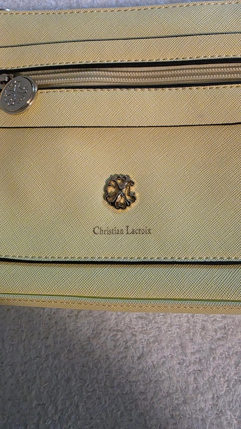 This is a lovely Christian Lacroix crossbody bag in a soft yellow shade. It's perfect for carrying your essentials while adding a touch of elegance to your outfit!