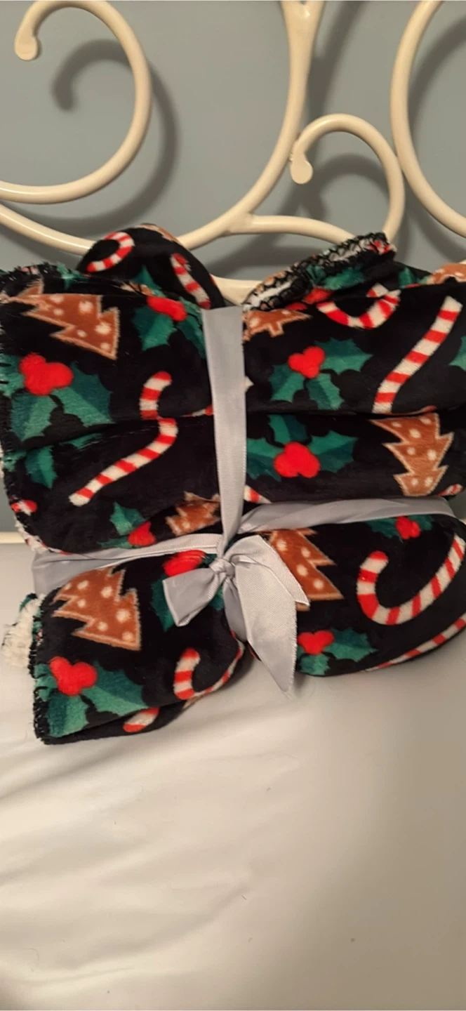 Snuggle up with this cozy sherpa blanket from Just Cozy! It features a festive holiday print with Christmas trees, candy canes, holly, and hearts on a black background. The blanket is 120x150cm and is made of super soft material. Originally bought for $25, this blanket is sure to keep you warm all winter long