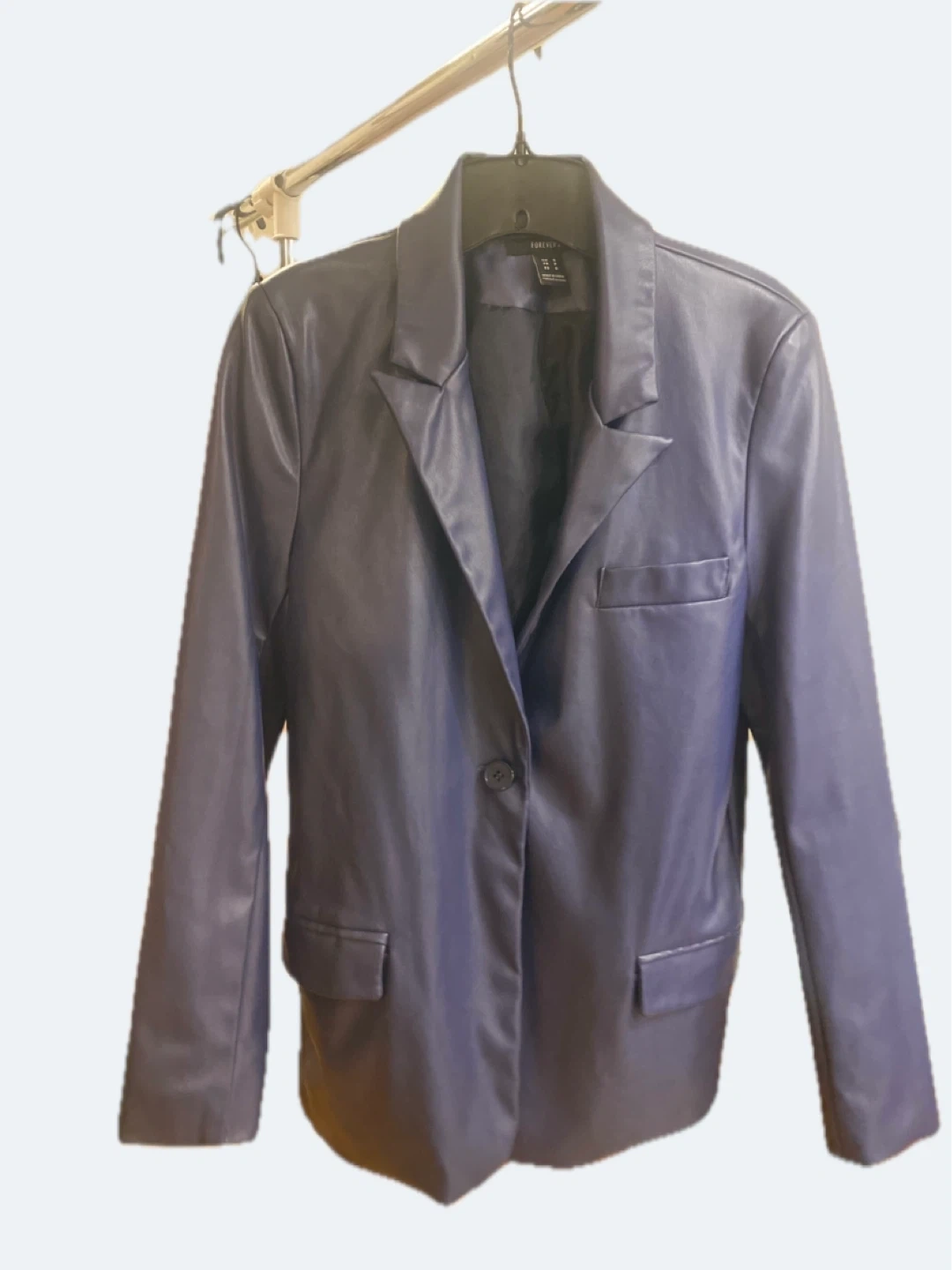 Selling a Forever 21 faux leather blazer in size navy blue. It's in great condition and has a sleek, stylish look. Perfect for adding a bit of edge to any outfit!